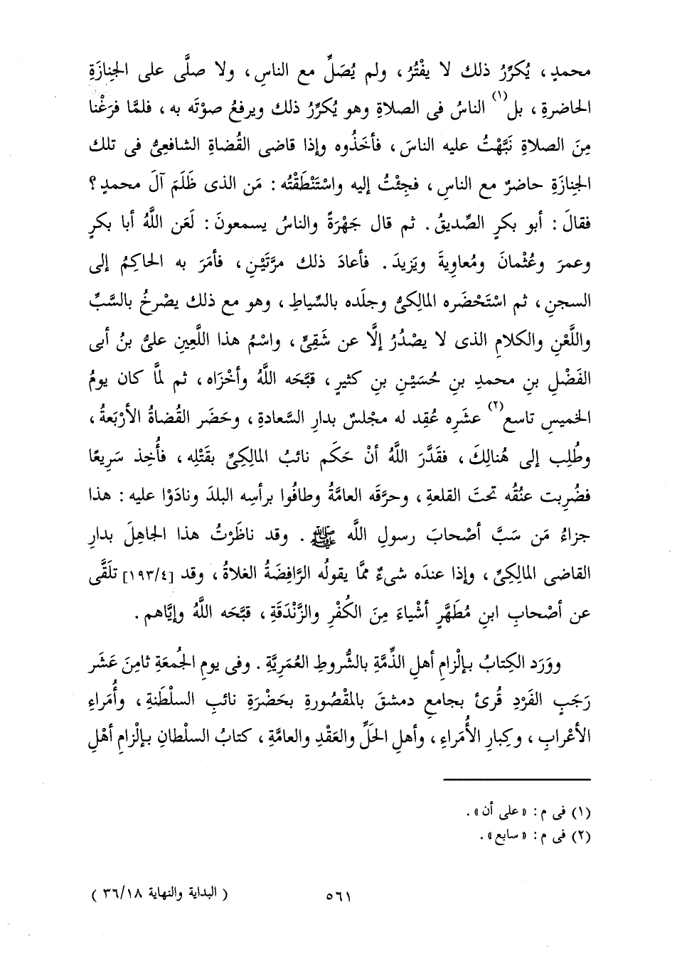 مُحَمَّدٍ، وَيُكَرِّرُ ذَلِكَ لَا يَفْتُرُ، وَلَمْ يُصَلِّ مَعَ النَّاسِ، وَلَا صَلَّى عَلَى الْجِنَازَةِ الْحَاضِرَةِ، بَلِ النَّاسُ فِي الصَّلَاةِ وَهُوَ يُكَرِّرُ ذَلِكَ وَيَرْفَعُ صَوْتَهُ بِهِ، فَلَمَّا فَرَغْنَا مِنَ الصَّلَاةِ نَبَّهْتُ عَلَيْهِ النَّاسَ، فَأَخَذُوهُ وَإِذَا قَاضِي الْقُضَاةِ الشَّافِعِيُّ فِي تِلْكَ الْجِنَازَةِ حَاضِرٌ مَعَ النَّاسِ، فَجِئْتُ إِلَيْهِ، وَاسْتَنْطَقْتُهُ: مَنِ الَّذِي ظَلَمَ آلَ مُحَمَّدٍ؟ فَقَالَ: أَبُو بَكْرٍ الصِّدِّيقُ. ثُمَّ قَالَ جَهْرَةً وَالنَّاسُ يَسْمَعُونَ: لَعَنَ اللَّهُ أَبَا بَكْرٍ، وَعُمَرَ، وَعُثْمَانَ، وَمُعَاوِيَةَ، وَيَزِيدَ. فَأَعَادَ ذَلِكَ مَرَّتَيْنِ، فَأَمَرَ بِهِ الْحَاكِمُ إِلَى السِّجْنِ، ثُمَّ اسْتَحْضَرَهُ الْمَالِكِيُّ وَجَلَدَهُ بِالسِّيَاطِ، وَهُوَ مَعَ ذَلِكَ يَصْرُخُ بِالسَّبِّ وَاللَّعْنِ وَالْكَلَامِ الَّذِي لَا يَصْدُرُ إِلَّا عَنْ شَقِيٍّ، وَاسْمُ هَذَا اللَّعِينِ عَلِيُّ بْنُ أَبِي الْفَضْلِ بْنِ مُحَمَّدِ بْنِ حُسَيْنِ بْنِ كَثِيرٍ، قَبَّحَهُ اللَّهُ وَأَخْزَاهُ، ثُمَّ لَمَّا كَانَ يَوْمُ الْخَمِيسِ تَاسِعَ عَشَرَهُ عُقِدَ لَهُ مَجْلِسٌ بِدَارِ السَّعَادَةِ، وَحَضَرَ الْقُضَاةُ الْأَرْبَعَةُ، وَطُلِبَ إِلَى هُنَالِكَ، فَقَدَّرَ اللَّهُ أَنْ حَكَمَ نَائِبُ الْمَالِكِيِّ بِقَتْلِهِ، فَأُخِذَ سَرِيعًا، فَضُرِبَتْ عُنُقُهُ تَحْتَ الْقَلْعَةِ، وَحَرَّقَهُ الْعَامَّةُ، وَطَافُوا بِرَأْسِهِ الْبَلَدَ، وَنَادَوْا عَلَيْهِ: هَذَا جَزَاءُ مَنْ سَبَّ أَصْحَابَ رَسُولِ اللَّهِ - صَلَّى اللَّهُ عَلَيْهِ وَسَلَّمَ - وَقَدْ نَاظَرْتُ هَذَا الْجَاهِلَ بِدَارِ الْقَاضِي الْمَالِكِيِّ، وَإِذَا عِنْدَهُ شَيْءٌ مِمَّا يَقُولُهُ الرَّافِضَةُ الْغُلَاةُ، وَقَدْ تَلَقَّى عَنْ أَصْحَابِ ابْنِ مُطَهَّرٍ أَشْيَاءَ فِي الْكُفْرِ وَالزَّنْدَقَةِ، قَبَّحَهُ اللَّهُ وَإِيَّاهُمْ.