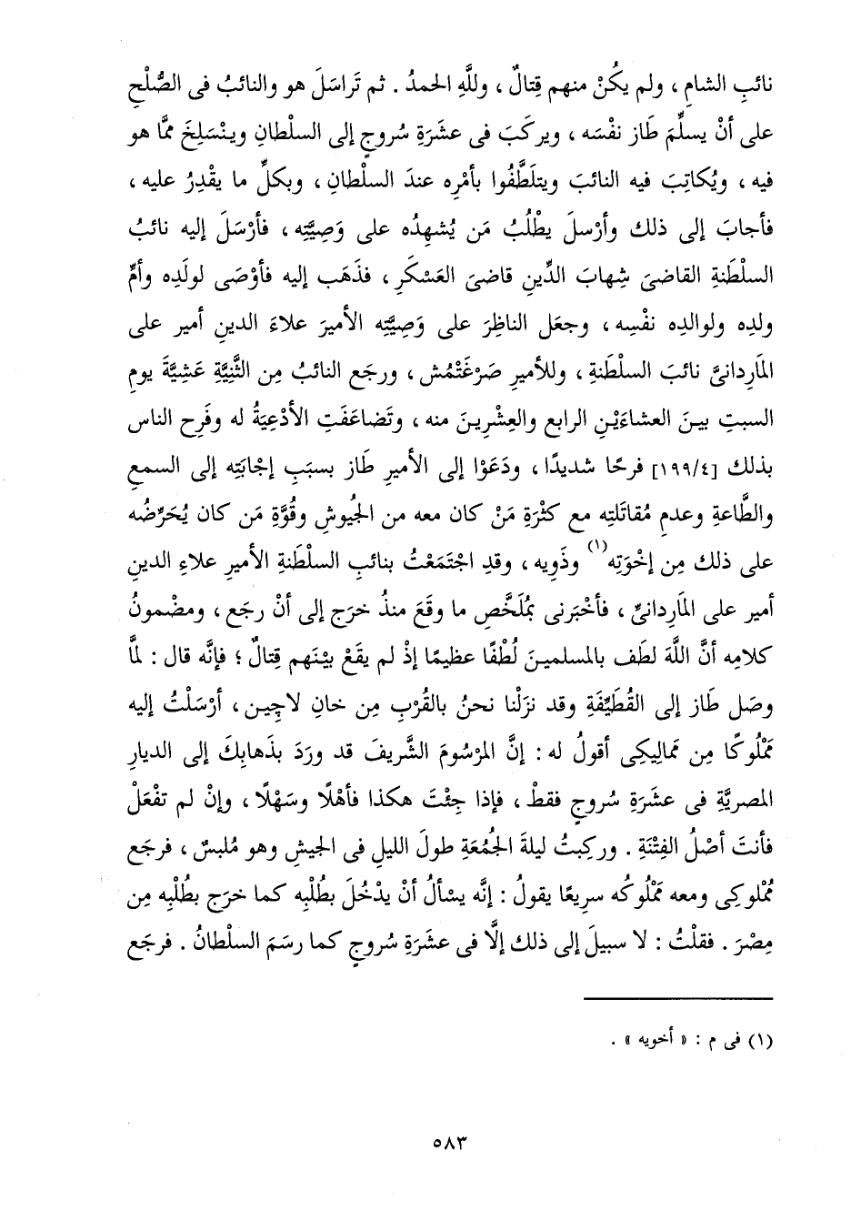 نَائِبِ الشَّامِ، وَلَمْ يَكُنْ مِنْهُمْ قِتَالٌ، وَلِلَّهِ الْحَمْدُ. ثُمَّ تَرَاسَلَ هُوَ وَالنَّائِبُ فِي الصُّلْحِ عَلَى أَنْ يُسَلِّمَ طَازْ نَفْسَهُ، وَيَرْكَبُ فِي عَشَرَةِ سُرُوجٍ إِلَى السُّلْطَانِ، وَيَنْسَلِخَ مِمَّا هُوَ فِيهِ، وَيُكَاتِبَ فِيهِ النَّائِبِ، وَيَتَلَطَّفُوا بِأَمْرِهِ عِنْدَ السُّلْطَانِ، وَبِكُلِّ مَا يَقْدِرُ عَلَيْهِ، فَأَجَابَ إِلَى ذَلِكَ، وَأَرْسَلَ يَطْلُبُ مَنْ يُشْهِدُهُ عَلَى وَصِيَّتِهِ، فَأَرْسَلَ إِلَيْهِ نَائِبُ السَّلْطَنَةِ الْقَاضِيَ شِهَابُ الدِّينِ قَاضِي الْعَسْكَرِ، فَذَهَبَ إِلَيْهِ، فَأَوْصَى لِوَلَدِهِ، وَأُمِّ وَلَدِهِ، وَلِوَالِدِهِ نَفْسِهِ، وَجَعَلَ النَّاظِرَ عَلَى وَصِيَّتِهِ الْأَمِيرَ عَلَاءَ الدِّينِ أَمِيرَ عَلِيَّ الْمَارِدَانِيَّ نَائِبَ السَّلْطَنَةِ، وَلِلْأَمِيرِ صَرْغَتْمُشَ، وَرَجَعَ النَّائِبُ مِنَ الثَّنِيَّةِ عَشِيَّةَ يَوْمِ السَّبْتِ بَيْنَ الْعِشَاءَيْنِ الرَّابِعِ وَالْعِشْرِينَ مِنْهُ، وَتَضَاعَفَتِ الْأَدْعِيَةُ لَهُ، وَفَرِحَ النَّاسُ بِذَلِكَ فَرَحًا شَدِيدًا، وَدَعَوْا إِلَى الْأَمِيرِ طَازْ بِسَبَبِ إِجَابَتِهِ إِلَى السَّمْعِ وَالطَّاعَةِ، وَعَدَمِ مُقَاتَلَتِهِ مَعَ كَثْرَةِ مَنْ كَانَ مَعَهُ مِنَ الْجُيُوشِ، وَقُوَّةِ مَنْ كَانَ يُحَرِّضُهُ عَلَى ذَلِكَ مِنْ إِخْوَتِهِ وَذَوِيِهِ، وَقَدِ اجْتَمَعْتُ بِنَائِبِ السَّلْطَنَةِ الْأَمِيرِ عَلَاءِ الدِّينِ أَمِيرِ عَلِيٍّ الْمَارِدَانِيِّ، فَأَخْبَرَنِي بِمُلَخَّصِ مَا وَقَعَ مُنْذُ خَرَجَ إِلَى أَنْ رَجَعَ، وَمَضْمُونُ كَلَامِهِ أَنَّ اللَّهَ لَطَفَ بِالْمُسْلِمِينَ لُطْفًا عَظِيمًا; إِذْ لَمْ يَقَعْ بَيْنَهُمْ قِتَالٌ، فَإِنَّهُ قَالَ: لَمَّا وَصَلَ طَازْ إِلَى الْقُطَيِّفَةِ - وَقَدْ نَزَلْنَا نَحْنُ بِالْقُرْبِ مِنْ خَانِ لَاجِينَ - أَرْسَلْتُ إِلَيْهِ مَمْلُوكًا مِنْ مَمَالِيكِي أَقُولُ لَهُ: إِنَّ الْمَرْسُومَ الشَّرِيفَ قَدْ وَرَدَ بِذَهَابِكَ إِلَى الدِّيَارِ الْمِصْرِيَّةِ فِي عَشَرَةِ سُرُوجٍ فَقَطْ، فَإِذَا جِئْتَ هَكَذَا فَأَهْلًا وَسَهْلًا، وَإِنْ لَمْ تَفْعَلْ فَأَنْتَ أَصْلُ الْفِتْنَةِ. وَرَكِبْتُ لَيْلَةَ الْجُمُعَةِ طُولَ اللَّيْلِ فِي الْجَيْشِ وَهُوَ مُلْبَسٌ، فَرَجَعَ مَمْلُوكِي وَمَعَهُ مَمْلُوكُهُ سَرِيعًا يَقُولُ: إِنَّهُ يَسْأَلُ أَنْ يَدْخُلَ بِطُلْبِهِ كَمَا خَرَجَ بِطُلْبِهِ مِنْ مِصْرَ، فَقُلْتُ: لَا سَبِيلَ إِلَى ذَلِكَ إِلَّا فِي عَشَرَةِ سُرُوجٍ كَمَا رَسَمَ السُّلْطَانُ. فَرَجَعَ،