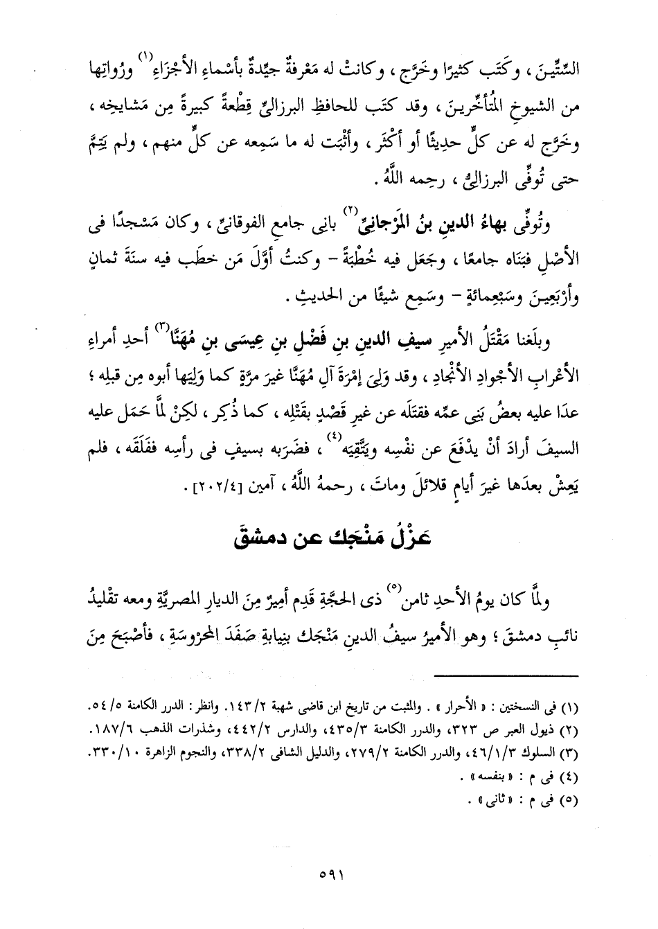 وَبَلَغَنَا مَقْتَلُ الْأَمِيرِ سَيْفِ الدِّينِ بْنِ فَضْلِ بْنِ عِيسَى بْنِ مُهَنَّا أَحَدِ أُمَرَاءِ الْأَعْرَابِ الْأَجْوَادِ الْأَنْجَادِ، وَقَدْ وَلِيَ إِمْرَةَ آلِ مُهَنَّا غَيْرَ مَرَّةٍ كَمَا وَلِيَهَا أَبُوهُ مِنْ قَبْلِهِ; عَدَا عَلَيْهِ بَعْضُ بَنِي عَمِّهِ فَقَتَلَهُ عَنْ غَيْرِ قَصْدٍ بِقَتْلِهِ، كَمَا ذُكِرَ، لَكِنْ لَمَّا حَمَلَ عَلَيْهِ السَّيْفَ أَرَادَ أَنْ يَدْفَعَ عَنْ نَفْسِهِ وَيَتَّقِيَهُ، فَضَرَبَهُ بِسَيْفٍ فِي رَأْسِهِ فَفَلَقَهُ، فَلَمْ يَعِشْ بَعْدَهَا غَيْرَ أَيَّامًا قَلَائِلَ وَمَاتَ، رَحِمَهُ اللَّهُ. آمِينَ.