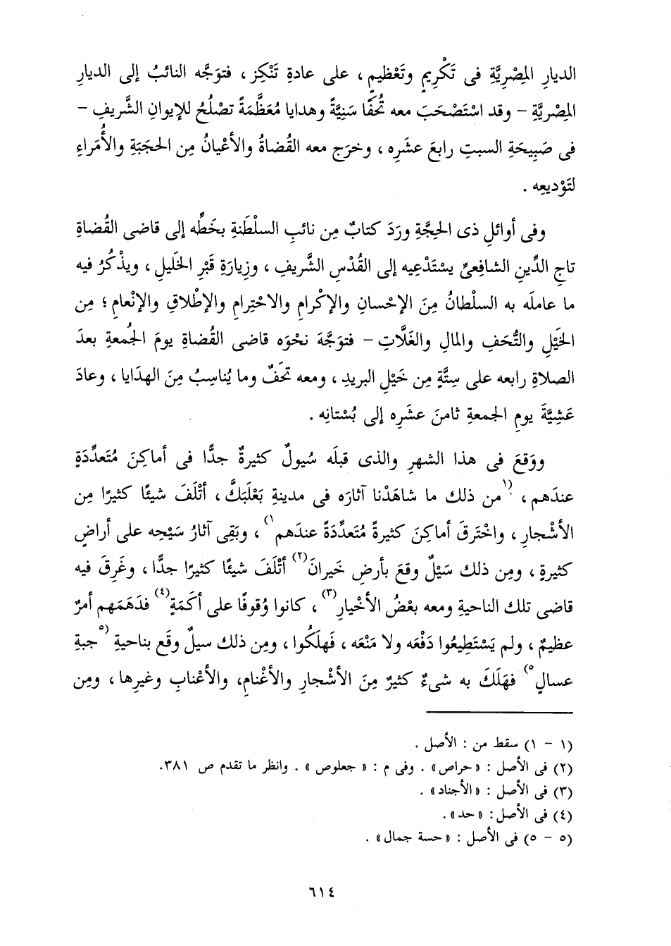 وَوَقَعَ فِي هَذَا الشَّهْرِ وَالَّذِي قَبْلَهُ سُيُولٌ كَثِيرَةٌ جِدًّا فِي أَمَاكِنَ مُتَعَدِّدَةٍ عِنْدَهُمْ، مِنْ ذَلِكَ مَا شَاهَدْنَا آثَارَهُ فِي مَدِينَةِ بَعْلَبَكَّ، أَتْلَفَ شَيْئًا كَثِيرًا مِنَ الْأَشْجَارِ، وَاخْتَرَقَ أَمَاكِنَ كَثِيرَةً مُتَعَدِّدَةً عِنْدَهُمْ، وَبَقِيَ آثَارُ سَيْحِهِ عَلَى أَرَاضٍ كَثِيرَةٍ، وَمِنْ ذَلِكَ سَيْلٌ وَقَعَ بِأَرْضِ خَيْرَانَ، أَتْلَفَ شَيْئًا كَثِيرًا جِدًّا، وَغَرِقَ فِيهِ قَاضِي تِلْكَ النَّاحِيَةِ، وَمَعَهُ بَعْضُ الْأَخْيَارِ، كَانُوا وُقُوفًا عَلَى أَكَمَةٍ فَدَهَمَهُمْ أَمْرٌ عَظِيمٌ، وَلَمْ يَسْتَطِيعُوا دَفْعَهُ وَلَا مَنْعَهُ فَهَلَكُوا، وَمِنْ ذَلِكَ سَيْلٌ وَقَعَ بِنَاحِيَةِ جُبَّةِ عَسَّالٍ فَهَلَكَ بِهِ شَيْءٌ كَثِيرٌ مِنَ الْأَشْجَارِ، وَالْأَغْنَامِ، وَالْأَعْنَابِ، وَغَيْرِهَا، وَمِنْ