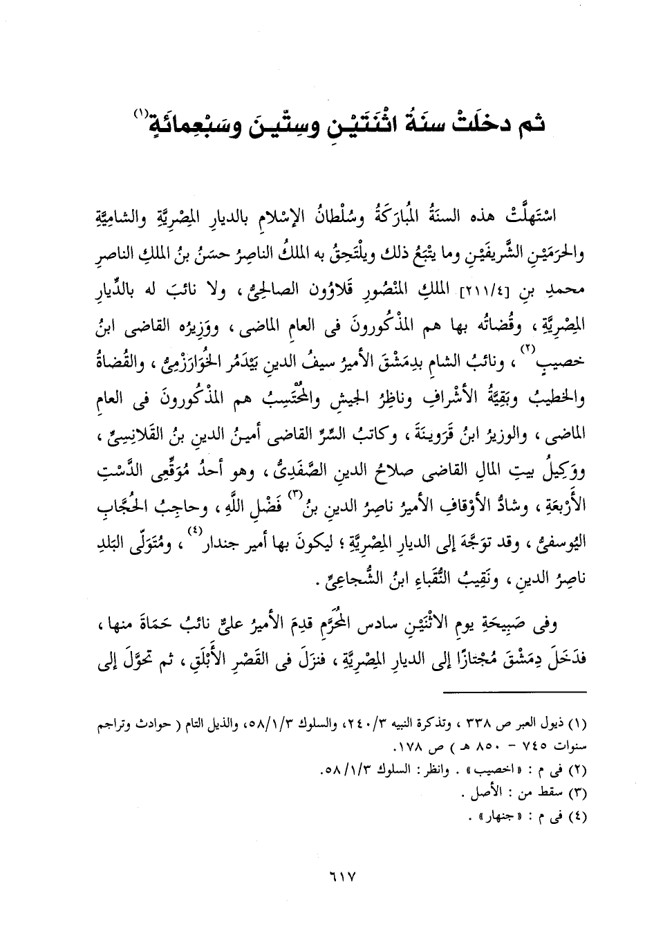 اسْتَهَلَّتْ هَذِهِ السَّنَةُ الْمُبَارَكَةُ وَسُلْطَانُ الْإِسْلَامِ بِالدِّيَارِ الْمِصْرِيَّةِ، وَالشَّامِيَّةِ، وَالْحَرَمَيْنِ الشَّرِيفَيْنِ، وَمَا يَتْبَعُ ذَلِكَ وَيَلْتَحِقُ بِهِ - الْمَلِكُ النَّاصِرُ حَسَنٌ ابْنُ الْمَلِكِ النَّاصِرِ مُحَمَّدٍ ابْنِ الْمَلِكِ الْمَنْصُورِ قَلَاوُونَ الصَّالِحِيُّ، وَلَا نَائِبَ لَهُ بِالدِّيَارِ الْمِصْرِيَّةِ، وَقُضَاتُهُ بِهَا هُمُ الْمَذْكُورُونَ فِي الْعَامِ الْمَاضِي، وَوَزِيرُهُ الْقَاضِي ابْنُ خَصِيبٍ، وَنَائِبُ الشَّامِ بِدِمَشْقَ الْأَمِيرُ سَيْفُ الدِّينِ بَيْدَمُرُ الْخَوَارِزْمِيُّ، وَالْقُضَاةُ وَالْخَطِيبُ وَبَقِيَّةُ الْأَشْرَافِ وَنَاظِرُ الْجَيْشِ وَالْمُحْتَسِبُ هُمُ الْمَذْكُورُونَ فِي الْعَامِ الْمَاضِي، وَالْوَزِيرُ ابْنُ قَرَوَيْنَهَ، وَكَاتِبُ السِّرِّ الْقَاضِي أَمِينُ الدِّينِ بْنُ الْقَلَانِسِيِّ، وَوَكِيلُ بَيْتِ الْمَالِ الْقَاضِي صَلَاحُ الدِّينِ الصَّفَدَيُّ، وَهُوَ أَحَدُ مُوَقِّعِي الدَّسْتِ الْأَرْبَعَةِ، وَشَادُّ الْأَوْقَافِ الْأَمِيرُ نَاصِرُ الدِّينِ بْنُ فَضْلِ اللَّهِ، وَحَاجِبُ الْحُجَّابِ الْيُوسُفِيُّ، وَقَدْ تَوَجَّهَ إِلَى الدِّيَارِ الْمِصْرِيَّةِ لِيَكُونَ بِهَا أَمِيرَ جُنْدَارَ، وَمُتَوَلِّي الْبَلَدِ نَاصِرُ الدِّينِ، وَنَقِيبُ النُّقَبَاءِ ابْنُ الشُّجَاعِيِّ.