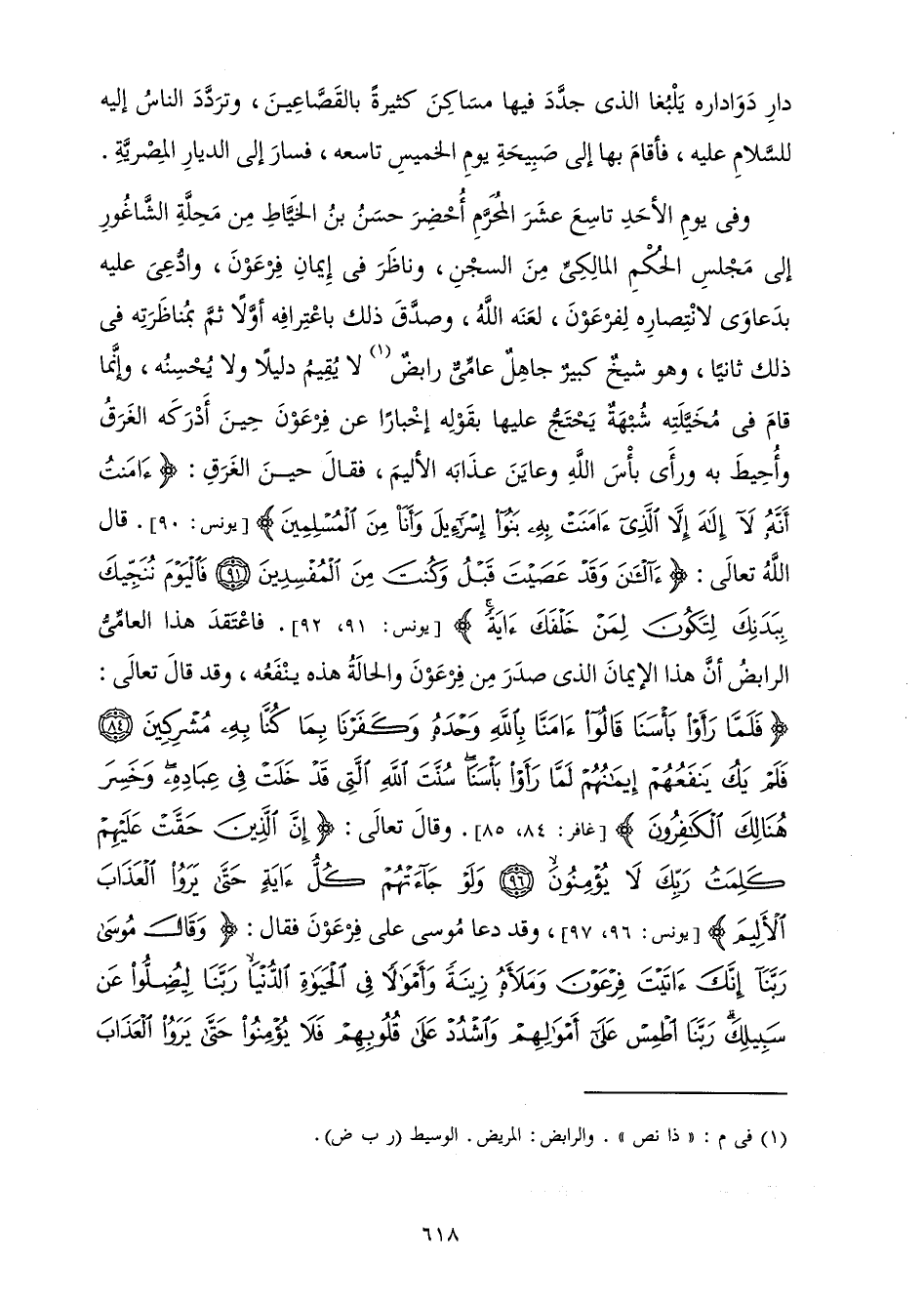 وَفِي يَوْمِ الْأَحَدِ تَاسِعَ عَشَرَ الْمُحَرَّمِ أُحْضِرَ حَسَنُ بْنُ الْخَيَّاطِ مِنْ مَحِلَّةِ الشَّاغُورِ إِلَى مَجْلِسِ الْحُكْمِ الْمَالِكِيِّ مِنَ السِّجْنِ، وَنَاظَرَ فِي إِيمَانِ فِرْعَوْنَ، وَادُّعِيَ عَلَيْهِ بِدَعَاوَى لِانْتِصَارِهِ لِفِرْعَوْنَ - لَعَنَهُ اللَّهُ - وَصَدَّقَ ذَلِكَ بِاعْتِرَافِهِ أَوَّلًا، ثُمَّ بِمُنَاظَرَتِهِ فِي ذَلِكَ ثَانِيًا، وَهُوَ شَيْخٌ كَبِيرٌ جَاهِلٌ عَامِّيٌّ رَابِضٌ، لَا يُقِيمُ دَلِيلًا وَلَا يُحْسِنُهُ، وَإِنَّمَا قَامَ فِي مُخَيَّلَتِهِ شُبْهَةٌ يَحْتَجُّ عَلَيْهَا بِقَوْلِهِ إِخْبَارًا عَنْ فِرْعَوْنَ حِينَ أَدْرَكَهُ الْغَرَقُ، وَأُحِيطَ بِهِ، وَرَأَى بَأْسَ اللَّهِ، وَعَايَنَ عَذَابَهُ الْأَلِيمَ، فَقَالَ حِينَ الْغَرَقِ: {آمَنْتُ أَنَّهُ لَا إِلَهَ إِلَّا الَّذِي آمَنَتْ بِهِ بَنُو إِسْرَائِيلَ وَأَنَا مِنَ الْمُسْلِمِينَ} [يونس: 90] . قَالَ اللَّهُ تَعَالَى: {الْآنَ وَقَدْ عَصَيْتَ قَبْلُ وَكُنْتَ مِنَ الْمُفْسِدِينَ فَالْيَوْمَ نُنَجِّيكَ بِبَدَنِكَ لِتَكُونَ لِمَنْ خَلْفَكَ آيَةً} [يونس: 91]