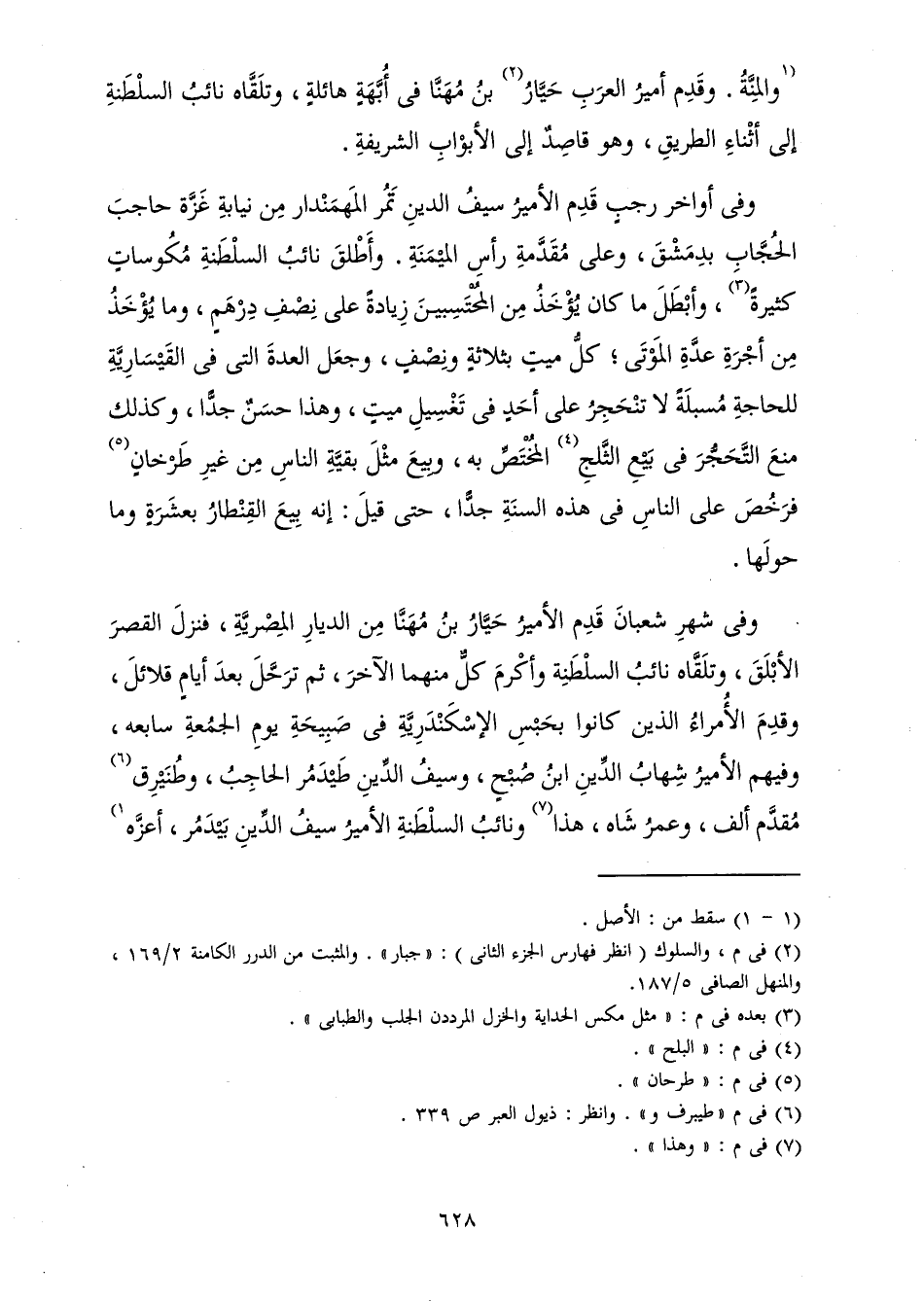 وَفِي أَوَاخِرِ رَجَبٍ قَدِمَ الْأَمِيرُ سَيْفُ الدِّينِ تَمُرُ الْمَهِمَنْدَارُ مِنْ نِيَابَةِ غَزَّةَ حَاجِبَ الْحُجَّابِ بِدِمَشْقَ، وَعَلَى مُقَدِّمَةِ رَأْسِ الْمَيْمَنَةِ، وَأَطْلَقَ نَائِبُ السَّلْطَنَةِ مُكُوسَاتٍ كَثِيرَةً، وَأَبْطَلَ مَا كَانَ يُؤْخَذُ مِنَ الْمُحْتَسِبِينَ زِيَادَةً عَلَى نِصْفِ دِرْهَمٍ، وَمَا يُؤْخَذُ مِنْ أُجْرَةِ عِدَّةِ الْمَوْتَى كُلُّ مَيِّتٍ بِثَلَاثَةٍ وَنِصْفٍ، وَجَعَلَ الْعِدَّةَ الَّتِي فِي الْقَيْسَارِيَّةِ لِلْحَاجَةِ مُسْبَلَةً لَا تَنْحَجِرُ عَلَى أَحَدٍ فِي تَغْسِيلٍ مَيِّتٍ، وَهَذَا حَسَنٌ جِدًّا، وَكَذَلِكَ مَنَعَ التَّحَجُّرَ فِي بَيْعِ الثَّلْجِ الْمُخْتَصِّ بِهِ، وَبِيعَ مِثْلَ بَقِيَّةِ النَّاسِ مِنْ غَيْرِ طَرْخَانٍ فَرَخُصَ عَلَى النَّاسِ فِي هَذِهِ السَّنَةِ جِدًّا، حَتَّى قِيلَ: إِنَّهُ بِيعَ الْقِنْطَارُ بِعَشَرَةٍ وَمَا حَوْلَهَا.