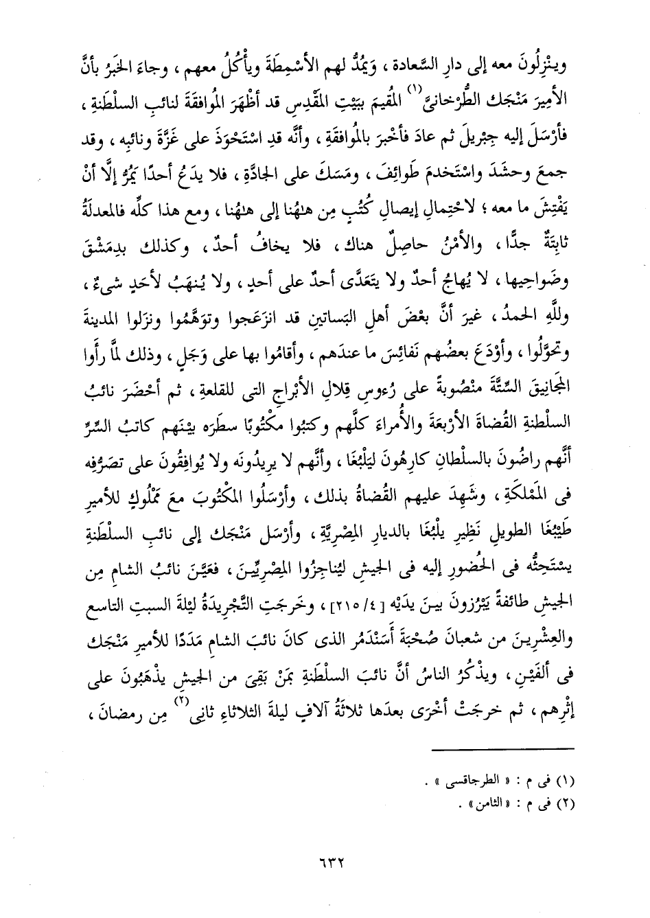 وَيَنْزِلُونَ مَعَهُ إِلَى دَارِ السَّعَادَةِ، وَيَمُدُّ لَهُمُ الْأَسْمِطَةَ وَيَأْكُلُ مَعَهُمْ، وَجَاءَ الْخَبَرُ بِأَنَّ الْأَمِيرَ مَنْجَكَ الطُّرْخَانِيَّ الْمُقِيمَ بِبَيْتِ الْمَقْدِسِ قَدْ أَظْهَرَ الْمُوَافَقَةَ لِنَائِبِ السَّلْطَنَةِ، فَأَرْسَلَ إِلَيْهِ جِبْرِيلَ، ثُمَّ عَادَ فَأَخْبَرَ بِالْمُوَافَقَةِ، وَأَنَّهُ قَدِ اسْتَحْوَذَ عَلَى غَزَّةَ، وَنَائِبِهِ، وَقَدْ جَمَعَ، وَحَشَدَ، وَاسْتَخْدَمَ طَوَائِفَ، وَمَسَكَ عَلَى الْجَادَّةِ، فَلَا يَدَعُ أَحَدًا يَمُرُّ إِلَّا أَنَّ يُفَتِّشَ مَا مَعَهُ لِاحْتِمَالِ إِيصَالِ كُتُبٍ مِنْ هَاهُنَا إِلَى هَاهُنَا، وَمَعَ هَذَا كُلِّهِ فَالْمُعَدْلَةُ ثَابِتَةٌ جِدًّا، وَالْأَمْنُ حَاصِلٌ هُنَاكَ، فَلَا يَخَافُ أَحَدٌ، وَكَذَلِكَ بِدِمَشْقَ وَضَوَاحِيهَا، لَا يُهَاجِ أَحَدٌ، وَلَا يَتَعَدَّى أَحَدٌ عَلَى أَحَدٍ، وَلَا يَنْهَبُ لِأَحَدٍ شَيْءٌ، وَلِلَّهِ الْحَمْدُ، غَيْرَ أَنَّ بَعْضَ أَهْلِ الْبَسَاتِينِ قَدِ انْزَعَجُوا وَتَوَهَّمُوا، وَنَزَلُوا الْمَدِينَةَ، وَتَحَوَّلُوا، وَأَوْدَعَ بَعْضُهُمْ نَفَائِسَ مَا عِنْدَهُمْ، وَأَقَامُوا بِهَا عَلَى وَجِلٍ; وَذَلِكَ لَمَّا رَأَوُا الْمَجَانِيقَ السِّتَّةَ مَنْصُوبَةً عَلَى رُءُوسِ قِلَالِ الْأَبْرَاجِ الَّتِي لِلْقَلْعَةِ، ثُمَّ أَحْضَرَ نَائِبُ السَّلْطَنَةِ الْقُضَاةَ الْأَرْبَعَةَ، وَالْأُمَرَاءَ كُلَّهُمْ، وَكَتَبُوا مَكْتُوبًا سَطَرَهُ بَيْنَهُمْ كَاتِبُ السِّرِّ: أَنَّهُمْ رَاضُونَ بِالسُّلْطَانِ، كَارِهُونَ لِيَلْبُغَا، وَأَنَّهُمْ لَا يُرِيدُونَهُ، وَلَا يُوَافِقُونَ عَلَى تَصَرُّفِهِ فِي الْمَمْلَكَةِ، وَشَهِدَ عَلَيْهِمُ الْقُضَاةُ بِذَلِكَ، وَأَرْسَلُوا الْمَكْتُوبَ مَعَ مَمْلُوكٍ لِلْأَمِيرِ طَيْبُغَا الطَّوِيلِ نَظِيرِ يَلْبُغَا بِالدِّيَارِ الْمِصْرِيَّةِ، وَأَرْسَلَ مَنْجَكَ إِلَى نَائِبِ السَّلْطَنَةِ يَسْتَحِثُّهُ فِي الْحُضُورِ إِلَيْهِ فِي الْجَيْشِ لِيُنَاجِزُوا الْمِصْرِيِّينَ، فَعَيَّنَ نَائِبُ الشَّامِ مِنَ الْجَيْشِ طَائِفَةً يَبْرُزُونَ بَيْنَ يَدَيْهِ، وَخَرَجَتِ التَّجْرِيدَةُ لَيْلَةَ السَّبْتِ التَّاسِعِ وَالْعِشْرِينَ مِنْ شَعْبَانَ صُحْبَةَ أَسَنْدَمُرَ الَّذِي كَانَ نَائِبَ الشَّامِ مَدَدًا لِلْأَمِيرِ مَنْجَكَ فِي أَلْفَيْنِ، وَيَذْكُرُ النَّاسُ أَنَّ نَائِبَ السَّلْطَنَةِ بِمَنْ بَقِيَ مِنَ الْجَيْشِ يَذْهَبُونَ عَلَى إِثْرِهِمْ، ثُمَّ خَرَجَتْ أُخْرَى بَعْدَهَا ثَلَاثَةُ آلَافٍ لَيْلَةَ الثُّلَاثَاءِ ثَانِيَ مِنْ رَمَضَانَ