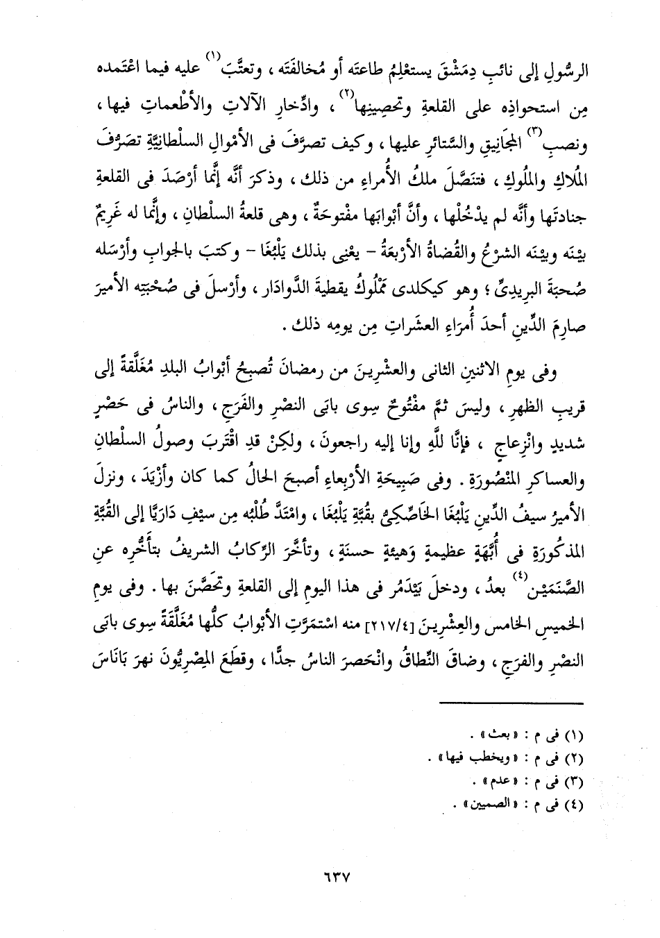 الرَّسُولِ إِلَى نَائِبِ دِمَشْقَ يَسْتَعْلِمُ طَاعَتَهُ أَوْ مُخَالَفَتَهُ، وَتَعَتَّبَ عَلَيْهِ فِيمَا اعْتَمَدَهُ مِنَ اسْتِحْوَاذِهِ عَلَى الْقَلْعَةِ وَتَحْصِينِهَا، وَادِّخَارِ الْآلَاتِ وَالْأَطْعِمَاتِ فِيهَا، وَنَصْبِ الْمَجَانِيقِ وَالسَّتَائِرِ عَلَيْهَا، وَكَيْفَ تَصَرَّفَ فِي الْأَمْوَالِ السُّلْطَانِيَّةِ تَصَرُّفَ الْمُلَّاكِ وَالْمُلُوكِ، فَتَنَصَّلَ مَلِكُ الْأُمَرَاءِ مِنْ ذَلِكَ، وَذَكَرَ أَنَّهُ إِنَّمَا أَرْصَدَ فِي الْقَلْعَةِ جَنَادِتَهَا، وَأَنَّهُ لَمْ يَدْخُلْهَا، وَأَنَّ أَبْوَابَهَا مَفْتُوحَةٌ، وَهِيَ قَلْعَةُ السُّلْطَانِ، وَإِنَّمَا لَهُ غَرِيمٌ بَيْنَهُ وَبَيْنَهُ الشَّرْعُ وَالْقُضَاةُ الْأَرْبَعَةُ - يَعْنِي بِذَلِكَ يَلْبُغَا - وَكَتَبَ بِالْجَوَابِ وَأَرْسَلَهُ صُحْبَةَ الْبَرِيدِيِّ، وَهُوَ كَيْكَلِدِي مَمْلُوكُ يَقْطِيَةَ الدَّوَادَارِ، وَأَرْسَلَ فِي صُحْبَتِهِ الْأَمِيرَ صَارِمَ الدِّينِ أَحَدَ أُمَرَاءِ الْعَشَرَاتِ مِنْ يَوْمِهِ ذَلِكَ.