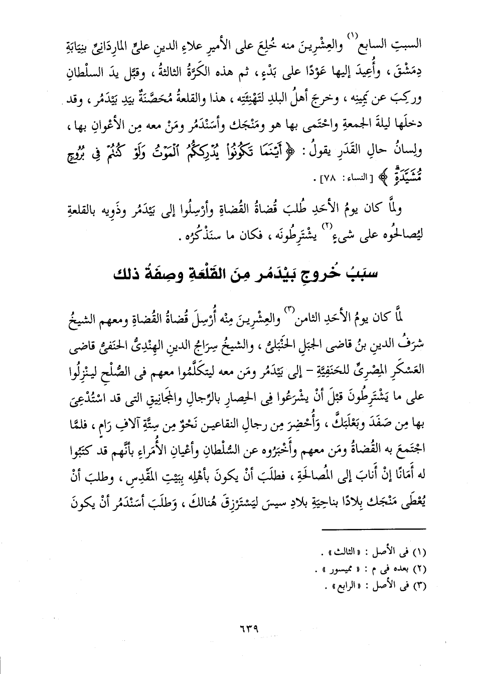 وَلَمَّا كَانَ يَوْمُ الْأَحَدِ طُلِبَ قُضَاةُ الْقُضَاةِ، وَأُرْسِلُوا إِلَى بَيْدَمُرَ وَذَوِيهِ بِالْقَلْعَةِ لِيُصَالِحُوهُ عَلَى شَيْءٍ يَشْتَرِطُونَهُ، فَكَانَ مَا سَنَذْكُرُهُ.