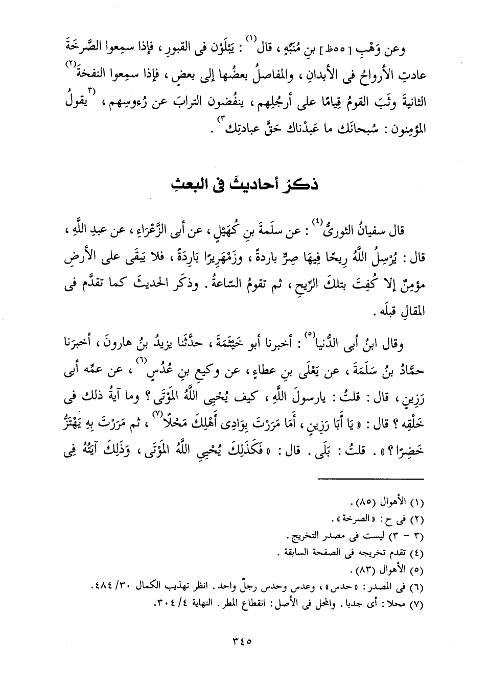 وَعَنْ وَهْبِ بْنِ مُنَبِّهٍ، قَالَ: يَبْلَوْنَ فِي الْقُبُورِ، فَإِذَا سَمِعُوا الصَّرْخَةَ عَادَتِ الْأَرْوَاحُ فِي الْأَبْدَانِ، وَالْمَفَاصِلُ بَعْضُهَا إِلَى بَعْضٍ، فَإِذَا سَمِعُوا النَّفْخَةَ الثَّانِيَةَ وَثَبَ الْقَوْمُ قِيَامًا عَلَى أَرْجُلِهِمْ، يَنْفُضُونَ التُّرَابَ عَنْ رُءُوسِهِمْ، يَقُولُ الْمُؤْمِنُونَ: سُبْحَانَكَ مَا عَبَدْنَاكَ حَقَّ عِبَادَتِكَ.