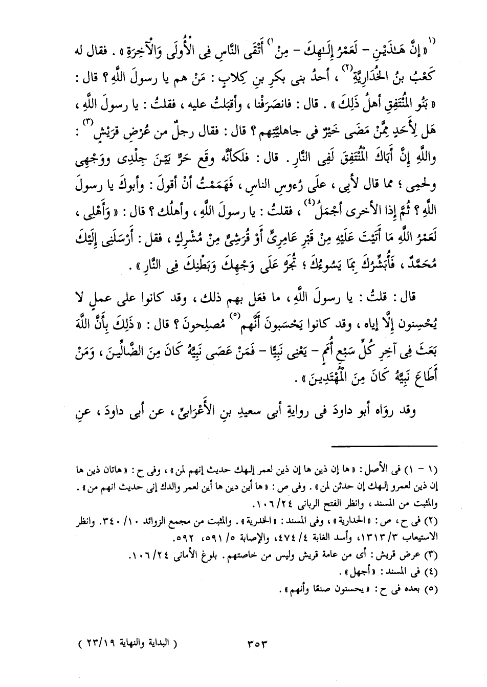 إِنَّ هَذَيْنِ - لَعَمْرُ إِلَهِكَ - مِنْ أَتْقَى النَّاسِ فِي الْأُولَى وَالْآخِرَةِ ". فَقَالَ لَهُ كَعْبُ بْنُ الْخُدَارِيِّةِ، أَحَدُ بَنِي بَكْرِ بْنِ كِلَابٍ: مَنْ هُمْ يَا رَسُولَ اللَّهِ؟ قَالَ: " بَنُو الْمُنْتَفِقِ أَهْلُ ذَلِكَ ". قَالَ: فَانْصَرَفْنَا، وَأَقْبَلْتُ عَلَيْهِ، فَقُلْتُ: يَا رَسُولَ اللَّهِ، هَلْ لِأَحَدٍ مِمَّنْ مَضَى خَيْرٌ فِي جَاهِلِيَّتِهِمْ؟ قَالَ: فَقَالَ رَجُلٌ مِنْ عُرْضِ قُرَيْشٍ: وَاللَّهِ إِنَّ أَبَاكَ الْمُنْتَفِقَ لَفِي النَّارِ. قَالَ: فَلَكَأَنَّهُ وَقَعَ حَرٌّ بَيْنَ جِلْدِي وَوَجْهِي وَلَحْمِي; مِمَّا قَالَ لِأَبِي، عَلَى رُءُوسِ النَّاسِ، فَهَمَمْتُ أَنْ أَقُولَ: وَأَبُوكَ يَا رَسُولَ اللَّهِ؟ ثُمَّ إِذَا الْأُخْرَى أَجْمَلُ، فَقُلْتُ: يَا رَسُولَ اللَّهِ، وَأَهْلُكَ؟ قَالَ: " وَأَهْلِي، لَعَمْرُ اللَّهِ مَا أَتَيْتَ عَلَيْهِ مِنْ قَبْرِ عَامِرِيٍّ أَوْ قُرَشِيٍّ مِنْ مُشْرِكٍ، فَقُلْ: أَرْسَلَنِي إِلَيْكَ مُحَمَّدٌ، فَأُبَشِّرُكَ بِمَا يَسُوءُكَ ; تُجَرُّ عَلَى وَجْهِكَ وَبَطْنِكَ فِي النَّارِ ".