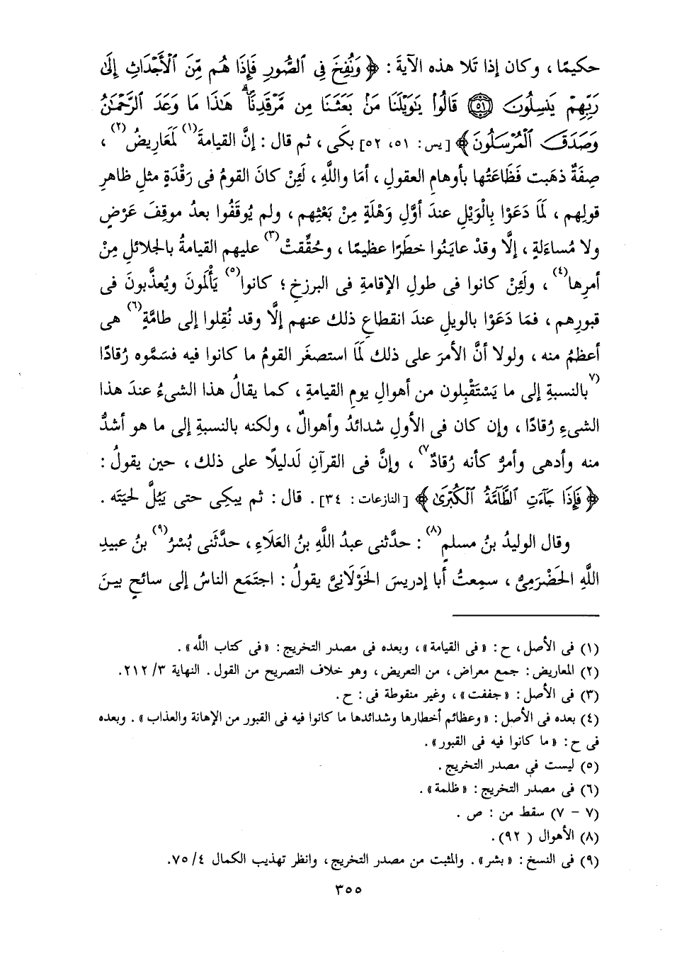 [51، 52] ، بَكَى، ثُمَّ قَالَ: إِنَّ الْقِيَامَةَ لَمَعَارِيضُ، صِفَةٌ ذَهَبَتْ فَظَاعَتُهَا بِأَوْهَامِ الْعُقُولِ، أَمَا وَاللَّهِ، لَئِنْ كَانَ الْقَوْمُ فِي رَقْدَةٍ مِثْلِ ظَاهِرِ قَوْلِهِمْ لَمَا دَعَوْا بِالْوَيْلِ عِنْدَ أَوَّلِ وَهْلَةٍ مِنْ بَعْثِهِمْ، وَلَمْ يُوقَفُوا بَعْدُ مَوْقِفَ عَرْضٍ وَلَا مُسَاءَلَةٍ، إِلَّا وَقَدْ عَايَنُوا خَطَرًا عَظِيمًا، وَحُقِّقَتْ عَلَيْهِمُ الْقِيَامَةُ بِالْجَلَائِلِ مِنْ أَمْرِهَا، وَلَئِنْ كَانُوا فِي طُولِ الْإِقَامَةِ فِي الْبَرْزَخِ; كَانُوا يَأْلَمُونَ وَيُعَذَّبُونَ فِي قُبُورِهِمْ، فَمَا دَعَوْا بِالْوَيْلِ عِنْدَ انْقِطَاعِ ذَلِكَ عَنْهُمْ إِلَّا وَقَدْ نُقِلُوا إِلَى طَامَّةٍ هِيَ أَعْظَمُ مِنْهُ، وَلَوْلَا أَنَّ الْأَمْرَ عَلَى ذَلِكَ لَمَا اسْتَصْغَرَ الْقَوْمُ مَا كَانُوا فِيهِ فَسَمَّوْهُ رُقَادًا بِالنِّسْبَةِ إِلَى مَا يَسْتَقْبِلُونَ مِنْ أَهْوَالِ يَوْمِ الْقِيَامَةِ، كَمَا يُقَالُ هَذَا الشَّيْءُ عِنْدَ هَذَا الشَّيْءِ رُقَادًا، وَإِنْ كَانَ فِي الْأَوَّلِ شَدَائِدُ وَأَهْوَالٌ، وَلَكِنَّهُ بِالنِّسْبَةِ إِلَى مَا هُوَ أَشَدُّ مِنْهُ وَأَدْهَى وَأَمَرُّ كَأَنَّهُ رُقَادٌ، وَإِنَّ فِي الْقُرْآنِ لَدَلِيلًا عَلَى ذَلِكَ، حِينَ يَقُولُ: {فَإِذَا جَاءَتِ الطَّامَّةُ الْكُبْرَى} [النازعات: 34] ، قَالَ: ثُمَّ يَبْكِي حَتَّى يَبُلَّ لِحْيَتَهُ.