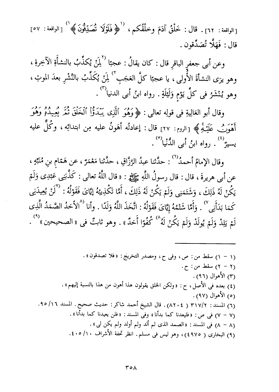 وَقَالَ الْإِمَامُ أَحْمَدُ: حَدَّثَنَا عَبْدُ الرَّزَّاقِ، حَدَّثَنَا مَعْمَرٌ، عَنْ هَمَّامِ بْنِ مُنَبِّهٍ، عَنْ أَبِي هُرَيْرَةَ، قَالَ: قَالَ رَسُولُ اللَّهِ صَلَّى اللَّهُ عَلَيْهِ وَسَلَّمَ: «قَالَ اللَّهُ تَعَالَى: كَذَّبَنِي عَبْدِي وَلَمْ يَكُنْ لَهُ ذَلِكَ، وَشَتَمَنِي وَلَمْ يَكُنْ لَهُ ذَلِكَ، أَمَّا تَكْذِيبُهُ إِيَّايَ فَقَوْلُهُ: لَنْ يُعِيدَنِي كَمَا بَدَأَنِي. وَأَمَّا شَتْمُهُ إِيَّايَ فَقَوْلُهُ: اتَّخَذَ اللَّهُ وَلَدًا. وَأَنَا الْأَحَدُ الصَّمَدُ الَّذِي لَمْ يَلِدْ وَلَمْ يُولَدْ وَلَمْ يَكُنْ لَهُ كُفُوًا أَحَدٌ ".» وَهُوَ ثَابِتٌ فِي " الصَّحِيحَيْنِ "