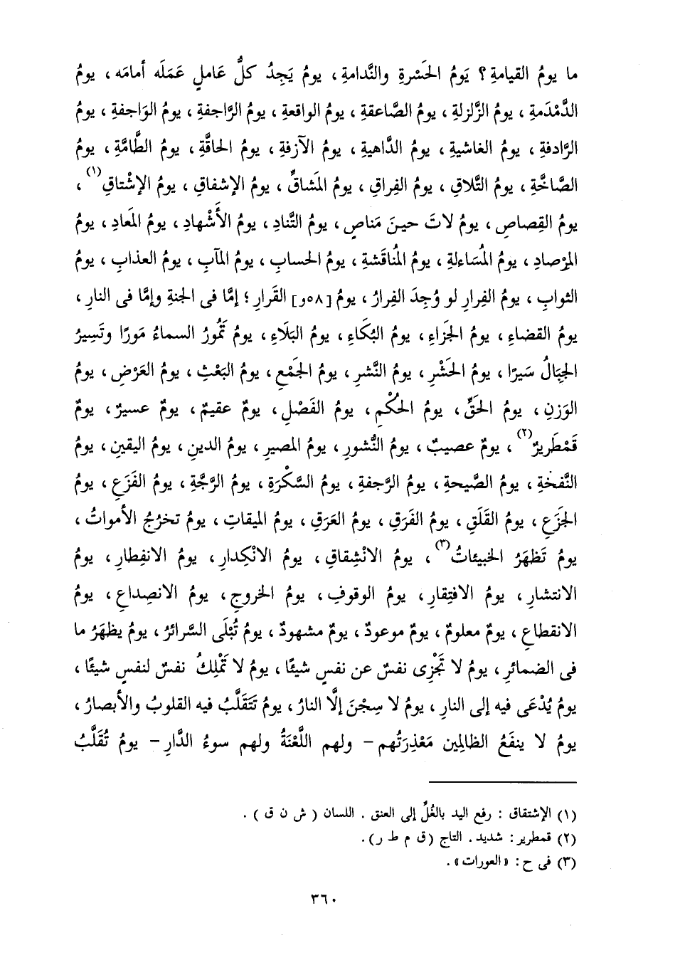 مَا يَوْمُ الْقِيَامَةِ؟ يَوْمُ الْحَسْرةِ وَالنَّدَامَةِ، يَوْمٌ يَجِدُ كُلُّ عَامِلٍ عَمَلَهُ أَمَامَهُ، يَوْمُ الدَّمْدَمَةِ، يَوْمُ الزَّلْزَلَةِ، يَوْمُ الصَّاعِقَةِ، يَوْمُ الْوَاقِعَةِ، يَوْمُ الرَّاجِفَةِ، يَوْمُ الْوَاجِفَةِ، يَوْمُ الرَّادِفَةِ، يَوْمُ الْغَاشِيَةِ، يَوْمُ الدَّاهِيَةِ، يَوْمُ الْآزِفَةِ، يَوْمُ الْحَاقَّةِ، يَوْمُ الطَّامَّةِ، يَوْمُ الصَّاخَّةِ، يَوْمُ التَّلَاقِ، يَوْمُ الْفِرَاقِ، يَوْمُ الْمَشَاقِّ، يَوْمُ الْإِشْفَاقِ، يَوْمُ الْإِشْتَاقِ، يَوْمُ الْقِصَاصِ، يَوْمُ لَاتَ حِينَ مَنَاصٍ، يَوْمُ التَّنَادِ، يَوْمُ الْأَشْهَادِ، يَوْمُ الْمَعَادِ، يَوْمُ الْمِرْصَادِ، يَوْمُ الْمُسَاءَلَةِ، يَوْمُ الْمُنَاقَشَةِ، يَوْمُ الْحِسَابِ، يَوْمُ الْمَآبِ، يَوْمُ الْعَذَابِ، يَوْمُ الثَّوَابِ، يَوْمُ الْفِرَارِ لَوْ وُجِدَ الْفِرَارُ، يَوْمُ الْقَرَارِ إِمَّا فِي الْجَنَّةِ، وَإِمَّا فِي النَّارِ، يَوْمُ الْقَضَاءِ، يَوْمُ الْجَزَاءِ، يَوْمُ الْبُكَاءِ، يَوْمُ الْبَلَاءِ، يَوْمُ تَمُورُ السَّمَاءُ مَوْرًا وَتَسِيرُ الْجِبَالُ سَيْرًا، يَوْمُ الْحَشْرِ، يَوْمُ النَّشْرِ، يَوْمُ الْجَمْعِ، يَوْمُ الْبَعْثِ، يَوْمُ الْعَرْضِ، يَوْمُ الْوَزْنِ، يَوْمُ الْحَقِّ، يَوْمُ الْحُكْمِ، يَوْمُ الْفَصْلِ، يَوْمٌ عَقِيمٌ، يَوْمٌ عَسِيرٌ، يَوْمٌ قَمْطَرِيرٌ، يَوْمٌ عَصِيبٌ، يَوْمُ النُّشُورِ، يَوْمُ الْمَصِيرِ، يَوْمُ الدِّينِ، يَوْمُ الْيَقِينِ، يَوْمُ النَّفْخَةِ، يَوْمُ الصَّيْحَةِ، يَوْمُ الرَّجْفَةِ، يَوْمُ السَّكْرَةِ، يَوْمُ الرَّجَّةِ، يَوْمُ الْفَزَعِ، يَوْمُ الْجَزَعِ، يَوْمُ الْقَلَقِ، يَوْمُ الْفَرَقِ، يَوْمُ الْعَرَقِ، يَوْمُ الْمِيقَاتِ، يَوْمٌ تَخْرُجُ الْأَمْوَاتُ، يَوْمٌ تَظْهَرُ الْخَبِيئَاتُ، يَوْمُ الِانْشِقَاقِ، يَوْمُ الِانْكِدَارِ، يَوْمُ الِانْفِطَارِ، يَوْمُ الِانْتِشَارِ، يَوْمُ الِافْتِقَارِ، يَوْمُ الْوُقُوفِ، يَوْمُ الْخُرُوجِ، يَوْمُ الِانْصِدَاعِ، يَوْمُ الِانْقِطَاعِ، يَوْمٌ مَعْلُومٌ، يَوْمٌ مَوْعُودٌ، يَوْمٌ مَشْهُودٌ، يَوْمُ تُبْلَى السَّرَائِرُ، يَوْمُ يَظْهَرُ مَا فِي الضَّمَائِرِ، يَوْمُ لَا تَجْزِي نَفْسٌ عَنْ نَفْسٍ شَيْئًا، يَوْمُ لَا تَمْلِكُ نَفْسٌ لِنَفْسٍ شَيْئًا، يَوْمُ يُدْعَى فِيهِ إِلَى النَّارِ، يَوْمُ لَا سِجْنَ إِلَّا النَّارُ، يَوْمُ تَتَقَلَّبُ فِيهِ الْقُلُوبُ وَالْأَبْصَارُ، يَوْمُ لَا يَنْفَعُ الظَّالِمِينَ مَعْذِرَتُهُمْ - وَلَهُمُ اللَّعْنَةُ وَلَهُمْ سُوءُ الدَّارِ - يَوْمُ تُقَلَّبُ