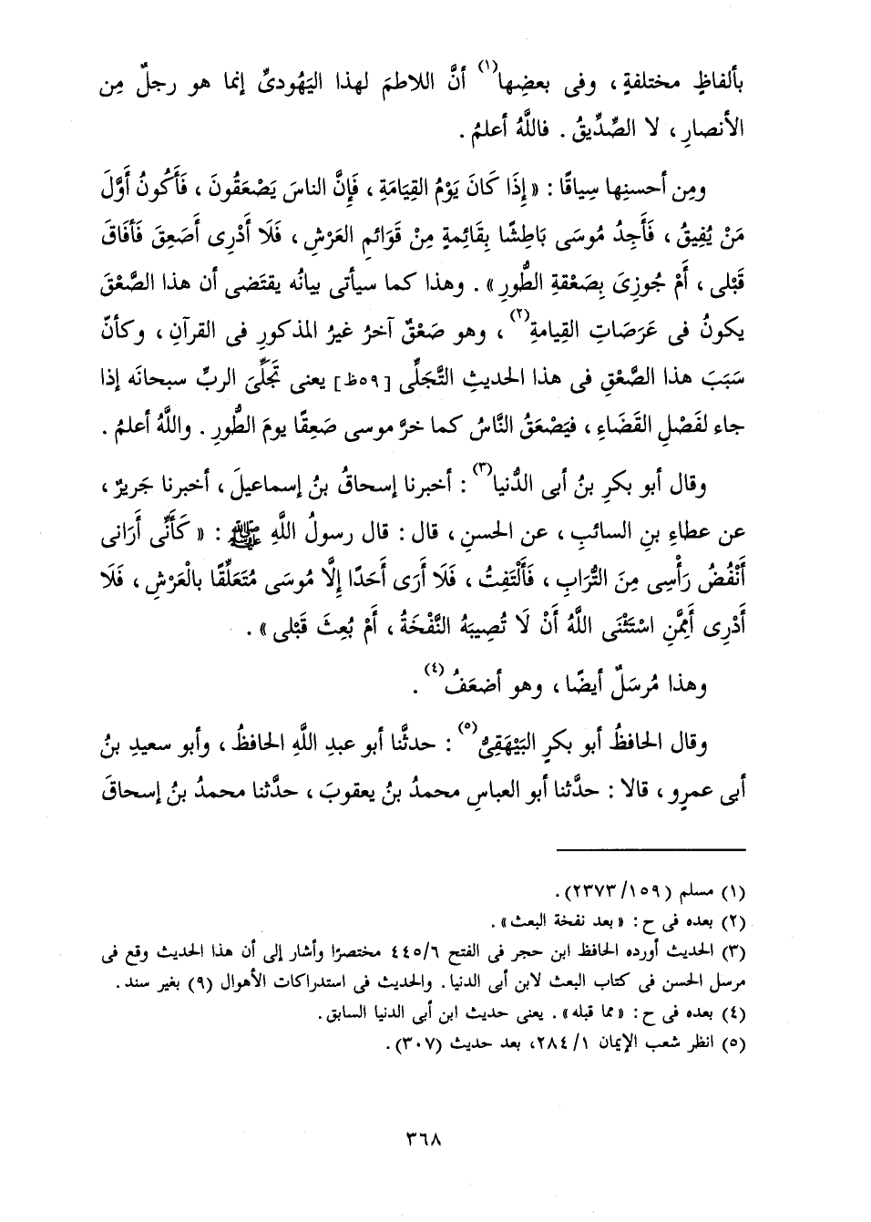 وَمِنْ أَحْسَنِهَا سِيَاقًا: " «إِذَا كَانَ يَوْمُ الْقِيَامَةِ، فَإِنَّ النَّاسَ يَصْعَقُونَ، فَأَكُونُ أَوَّلَ مَنْ يُفِيقُ، فَأَجِدُ مُوسَى بَاطِشًا بِقَائِمَةٍ مِنْ قَوَائِمِ الْعَرْشِ، فَلَا أَدْرِي أَصَعِقَ فَأَفَاقَ قَبْلِي، أَمْ جُوزِيَ بِصَعْقَةِ الطُّورِ» ) . وَهَذَا كَمَا سَيَأْتِي بَيَانُهُ يَقْتَضِي أَنَّ هَذَا الصَّعْقَ يَكُونُ فِي عَرَصَاتِ الْقِيَامَةِ، وَهُوَ صَعْقٌ آخَرُ غَيْرُ الْمَذْكُورِ فِي الْقُرْآنِ، وَكَأَنَّ سَبَبَ هَذَا الصَّعْقِ فِي هَذَا الْحَدِيثِ التَّجَلِّي، يَعْنِي تَجَلِّيَ الرَّبِّ سُبْحَانَهُ إِذَا جَاءَ لِفَصْلِ الْقَضَاءِ، فَيَصْعَقُ النَّاسُ كَمَا خَرَّ مُوسَى صَعِقًا يَوْمَ الطُّورِ. وَاللَّهُ أَعْلَمُ.
