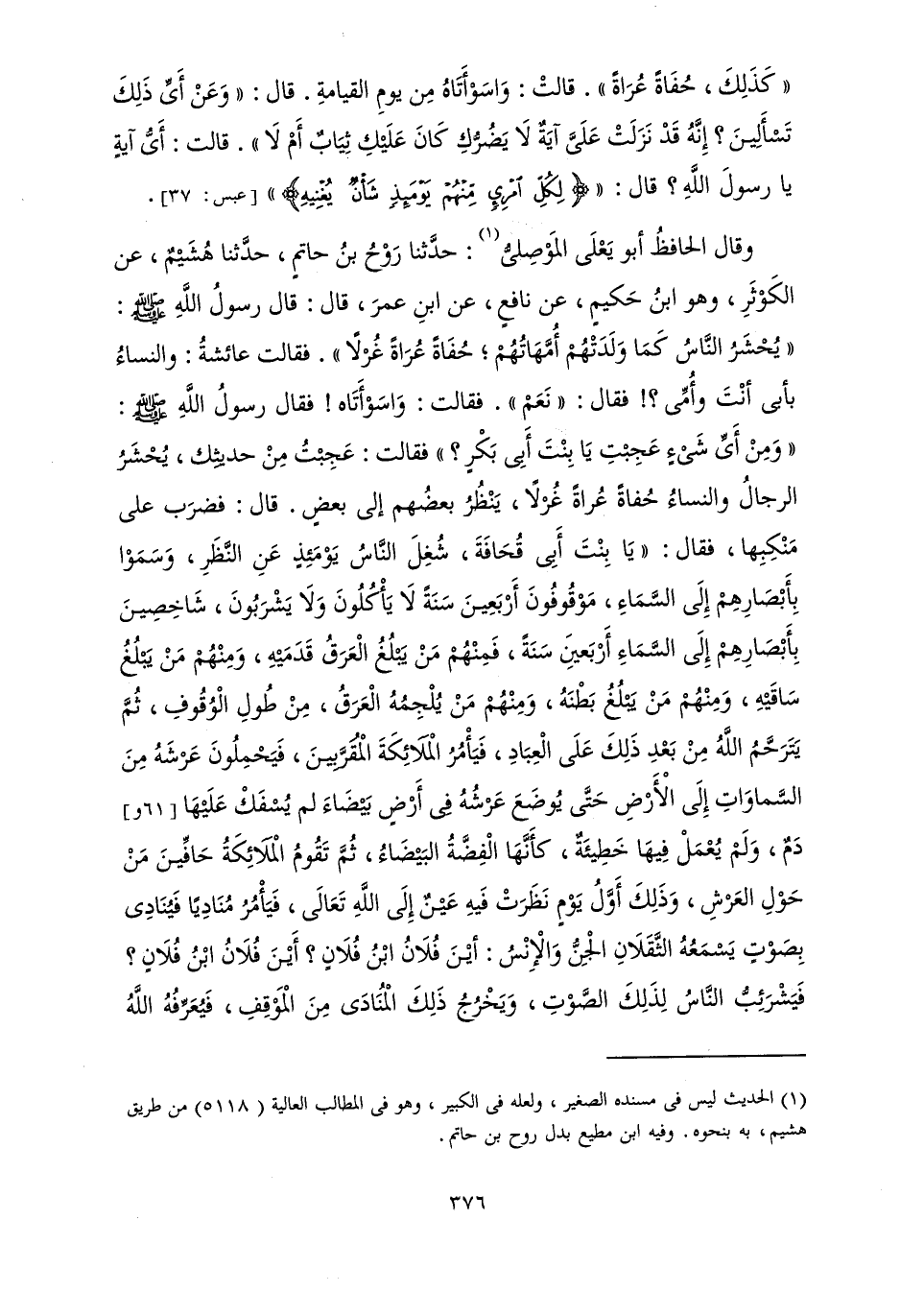 وَقَالَ الْحَافِظُ أَبُو يَعْلَى الْمَوْصِلِيُّ: حَدَّثَنَا رَوْحُ بْنُ حَاتِمٍ، حَدَّثَنَا هُشَيْمٌ، عَنِ الْكَوْثَرِ، وَهُوَ ابْنُ حَكِيمٍ، عَنْ نَافِعٍ، عَنِ ابْنِ عُمَرَ، قَالَ: قَالَ رَسُولُ اللَّهِ صَلَّى اللَّهُ عَلَيْهِ وَسَلَّمَ: " «يُحْشَرُ النَّاسُ كَمَا وَلَدَتْهُمْ أُمَّهَاتُهُمْ حُفَاةً عُرَاةً غُرْلًا ". فَقَالَتْ عَائِشَةُ: وَالنِّسَاءُ بِأَبِي أَنْتَ وَأُمِّي؟! فَقَالَ: " نَعَمْ ". فَقَالَتْ: وَاسَوْأَتَاهْ! فَقَالَ رَسُولُ اللَّهِ صَلَّى اللَّهُ عَلَيْهِ وَسَلَّمَ: " وَمِنْ أَيِّ شَيْءٍ عَجِبْتِ يَا بِنْتَ أَبِي بَكْرٍ؟ " فَقَالَتْ: عَجِبْتُ مِنْ حَدِيثِكَ، يُحْشَرُ الرِّجَالُ وَالنِّسَاءُ حُفَاةً عُرَاةً غُرْلًا، يَنْظُرُ بَعْضُهُمْ إِلَى بَعْضٍ. قَالَ: فَضَرَبَ عَلَى مَنْكِبِهَا، فَقَالَ: " يَا بِنْتَ أَبِي قُحَافَةَ، شُغِلَ النَّاسُ يَوْمَئِذٍ عَنِ النَّظَرِ، وَسَمَوْا بِأَبْصَارِهِمْ إِلَى السَّمَاءِ، مَوْقُوفُونَ أَرْبَعِينَ سَنَةً لَا يَأْكُلُونَ وَلَا يَشْرَبُونَ، شَاخِصِينَ بِأَبْصَارِهِمْ إِلَى السَّمَاءِ أَرْبَعِينَ سَنَةً، فَمِنْهُمْ مَنْ يَبْلُغُ الْعَرَقُ قَدَمَيْهِ، وَمِنْهُمْ مَنْ يَبْلُغُ سَاقَيْهِ، وَمِنْهُمْ مَنْ يَبْلُغُ بَطْنَهُ، وَمِنْهُمْ مَنْ يُلْجِمُهُ الْعَرَقُ، مِنْ طُولِ الْوُقُوفِ، ثُمَّ يَتَرَحَّمُ اللَّهُ مِنْ بَعْدِ ذَلِكَ عَلَى الْعِبَادِ، فَيَأْمُرُ الْمَلَائِكَةَ الْمقُرَّبِينَ، فَيَحْمِلُونَ عَرْشَهُ مِنَ السَّمَاوَاتِ إِلَى الْأَرْضِ حَتَّى يُوضَعَ عَرْشُهُ فِي أَرْضٍ بَيْضَاءَ لَمْ يُسْفَكْ عَلَيْهَا دَمٌ، وَلَمْ يُعْمَلْ فِيهَا خَطِيئَةٌ، كَأَنَّهَا الْفِضِّةُ الْبَيْضَاءُ، ثُمَّ تَقُومُ الْمَلَائِكَةُ حَافِّينَ مَنْ حَوْلِ الْعَرْشِ، وَذَلِكَ أَوَّلُ يَوْمٍ نَظَرَتْ فَيهِ عَيْنٌ إِلَى اللَّهِ تَعَالَى، فَيَأْمُرُ مُنَادِيًا فَيُنَادِي بِصَوْتٍ يَسْمَعُهُ الثَّقَلَانِ الْجِنُّ وَالْإِنْسُ: أَيْنَ فُلَانُ ابْنُ فُلَانٍ؟ أَيْنَ فُلَانُ ابْنُ فُلَانٍ؟ فَيَشْرَئِبُّ النَّاسُ لِذَلِكَ الصَّوْتِ، وَيَخْرُجُ ذَلِكَ الْمُنَادَى مِنَ الْمَوْقِفِ، فَيُعَرِّفُهُ اللَّهُ