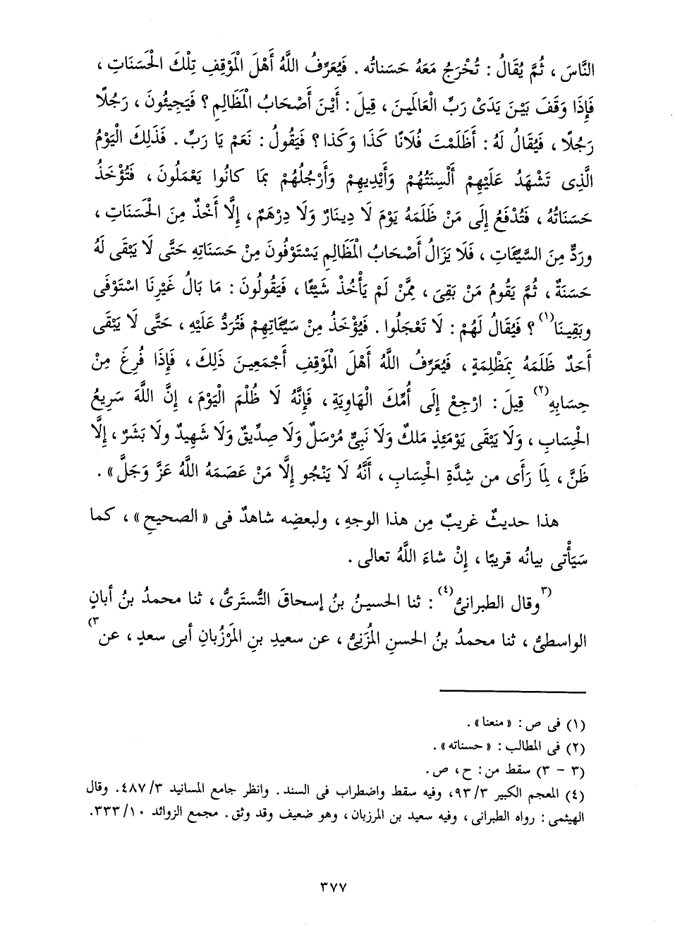 النَّاسَ، ثُمَّ يُقَالُ: تُخْرَجُ مَعَهُ حَسَنَاتُهُ. فَيُعَرِّفُ اللَّهُ أَهْلَ الْمَوْقِفِ تِلْكَ الْحَسَنَاتِ، فَإِذَا وَقَفَ بَيْنَ يَدَيْ رَبِّ الْعَالَمِينَ، قِيلَ: أَيْنَ أَصْحَابُ الْمَظَالِمِ؟ فَيَجِيئُونَ، رَجُلًا رَجُلًا، فَيُقَالُ لَهُ: أَظَلَمْتَ فُلَانًا كَذَا وَكَذَا؟ فَيَقُولُ: نَعَمْ يَا رَبِّ. فَذَلِكَ الْيَوْمُ الَّذِي تَشْهَدُ عَلَيْهِمْ أَلْسِنَتُهُمْ وَأَيْدِيهِمْ وَأَرْجُلُهُمْ بِمَا كَانُوا يَعْمَلُونَ، فَتُؤْخَذُ حَسَنَاتُهُ، فَتُدْفَعُ إِلَى مَنْ ظَلَمَهُ يَوْمَ لَا دِينَارٌ وَلَا دِرْهَمٌ، إِلَّا أَخْذٌ مِنَ الْحَسَنَاتِ، وَرَدٌّ مِنَ السَّيِّئَاتِ، فَلَا يَزَالُ أَصْحَابُ الْمَظَالِمِ يَسْتَوْفُونَ مِنْ حَسَنَاتِهِ حَتَّى لَا يَبْقَى لَهُ حَسَنَةٌ، ثُمَّ يَقُومُ مَنْ بَقِيَ مِمَّنْ لَمْ يَأْخُذْ شَيْئًا، فَيَقُولُونَ: مَا بَالُ غَيْرِنَا اسْتَوْفَى وَبَقِينَا؟ فَيُقَالُ لَهُمْ: لَا تَعْجَلُوا. فَيُؤْخَذُ مِنْ سَيِّئَاتِهِمْ فَتُرَدُّ عَلَيْهِ، حَتَّى لَا يَبْقَى أَحَدٌ ظَلَمَهُ بِمَظْلَمَةٍ، فَيُعَرِّفُ اللَّهُ أَهْلَ الْمَوْقِفِ أَجْمَعِينَ ذَلِكَ، فَإِذَا فُرِغَ مِنْ حِسَابِهِ قِيلَ: ارْجِعْ إِلَى أُمِّكَ الْهَاوِيَةِ، فَإِنَّهُ لَا ظُلْمَ الْيَوْمَ، إِنَّ اللَّهَ سَرِيعُ الْحِسَابِ، وَلَا يَبْقَى يَوْمَئِذٍ مَلَكٌ وَلَا نَبِيٌّ مُرْسَلٌ وَلَا صِدِّيقٌ وَلَا شَهِيدٌ وَلَا بَشَرٌ، إِلَّا ظَنَّ، لِمَا رَأَى مِنْ شِدَّةِ الْحِسَابِ، أَنَّهُ لَا يَنْجُو إِلَّا مَنْ عَصَمَهُ اللَّهُ عَزَّ وَجَلَّ» ".