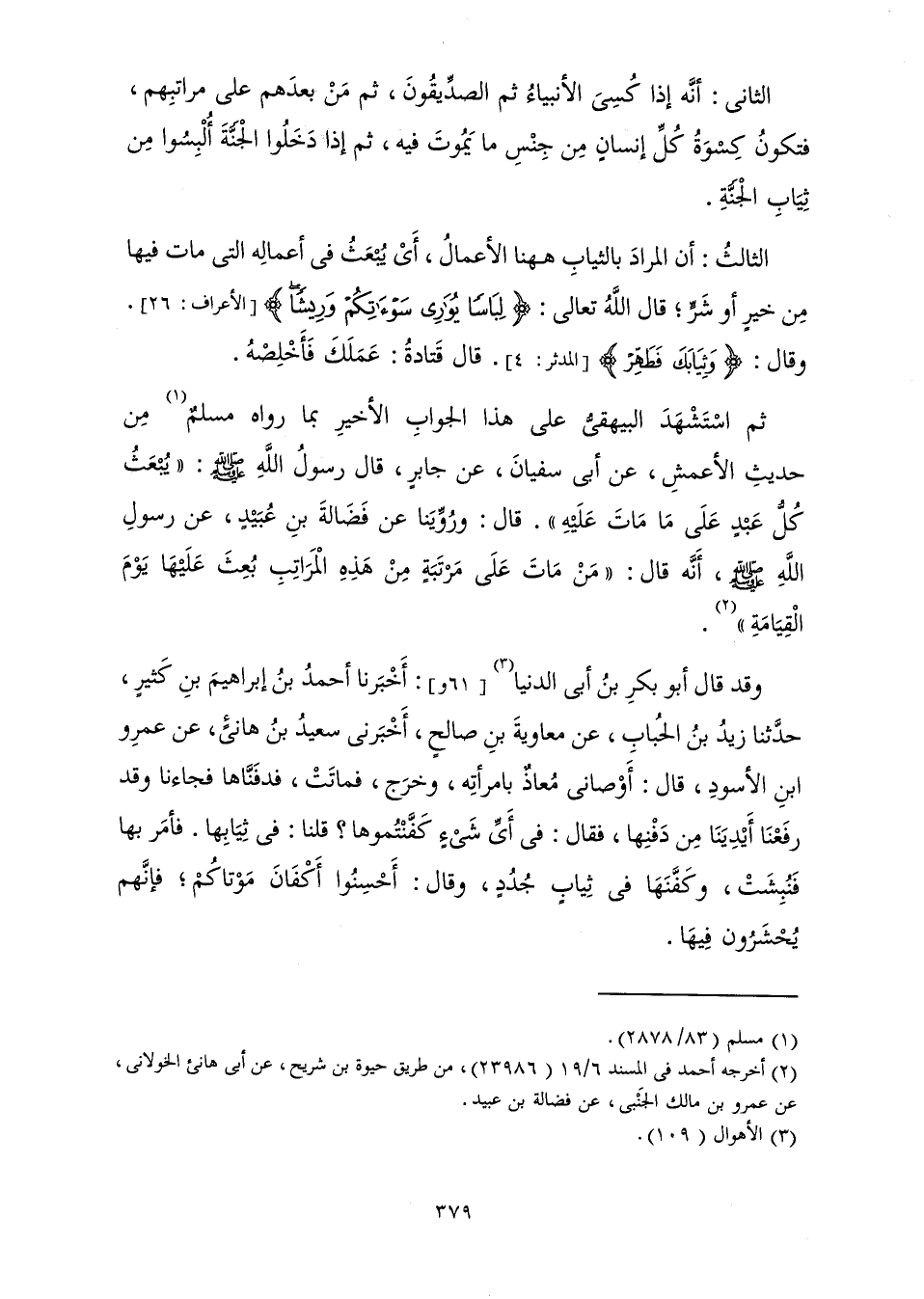 ثُمَّ اسْتَشْهَدَ الْبَيْهَقِيُّ عَلَى هَذَا الْجَوَابِ الْأَخِيرِ بِمَا رَوَاهُ مُسْلِمٌ مِنْ حَدِيثِ الْأَعْمَشِ، عَنْ أَبِي سُفْيَانَ، عَنْ جَابِرٍ، قَالَ رَسُولُ اللَّهِ صَلَّى اللَّهُ عَلَيْهِ وَسَلَّمَ: " «يُبْعَثُ كُلُّ عَبْدٍ عَلَى مَا مَاتَ عَلَيْهِ» ". قَالَ: وَرُوِّيَنَا عَنْ فَضَالَةَ بْنِ عُبَيْدٍ، عَنْ رَسُولِ اللَّهِ صَلَّى اللَّهُ عَلَيْهِ وَسَلَّمَ، أَنَّهُ قَالَ: " «مَنْ مَاتَ عَلَى مَرْتَبَةٍ مِنْ هَذِهِ الْمَرَاتِبِ بُعِثَ عَلَيْهَا يَوْمَ الْقِيَامَةِ» ".