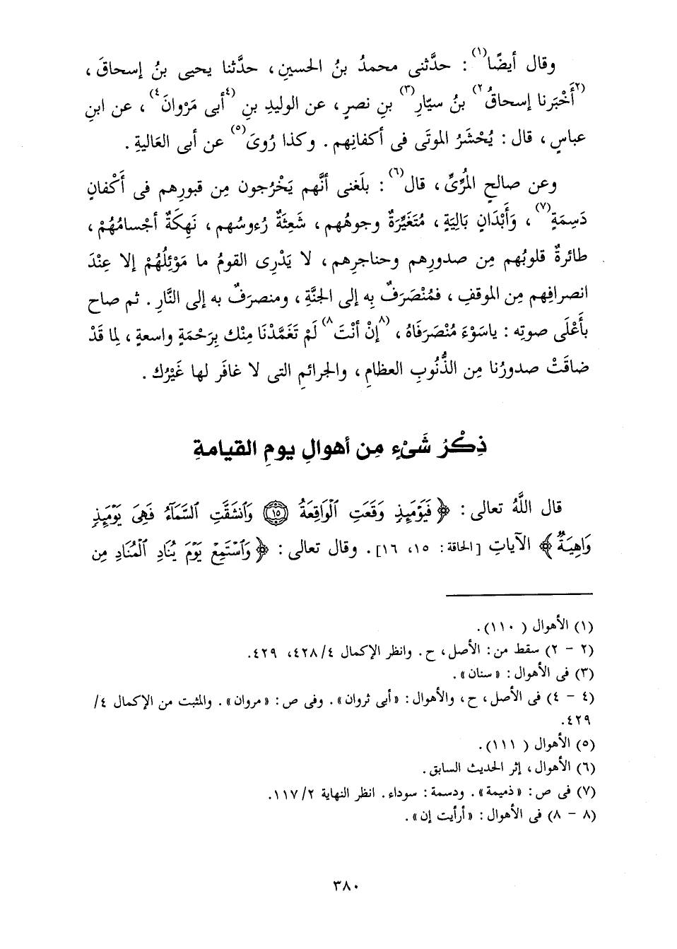 وَعَنْ صَالِحٍ الْمُرِّيِّ، قَالَ: بَلَغَنِي أَنَّهُمْ يَخْرُجُونَ مِنْ قُبُورِهِمْ فِي أَكْفَانٍ دَسِمَةٍ، وَأَبْدَانٍ بَالِيَةٍ، مُتَغَيِّرَةٌ وُجُوهُهُمْ، شَعِثَةٌ رُءُوسُهُمْ، نَهِكَةٌ أَجْسَامُهُمْ، طَائِرَةٌ قُلُوبُهُمْ مِنْ صُدُورِهِمْ وَحَنَاجِرِهِمْ، لَا يَدْرِي الْقَوْمُ مَا مَوْئِلُهُمْ إِلَّا عِنْدَ انْصِرَافِهِمْ مِنَ الْمَوْقِفِ، فَمُنْصَرَفٌ بِهِ إِلَى الْجَنَّةِ، وَمُنْصَرَفٌ بِهِ إِلَى النَّارِ، ثُمَّ صَاحَ بِأَعْلَى صَوْتِهِ: يَا سَوْءَ مُنْصَرَفَاهْ، إِنْ أَنْتَ لَمْ تَغَمَّدْنَا مِنْكَ بِرَحْمَةٍ وَاسِعَةٍ، لِمَا قَدْ ضَاقَتْ صُدُورُنَا مِنَ الذُّنُوبِ الْعِظَامِ، وَالْجَرَائِمِ الَّتِي لَا غَافِرَ لَهَا غَيْرُكَ.