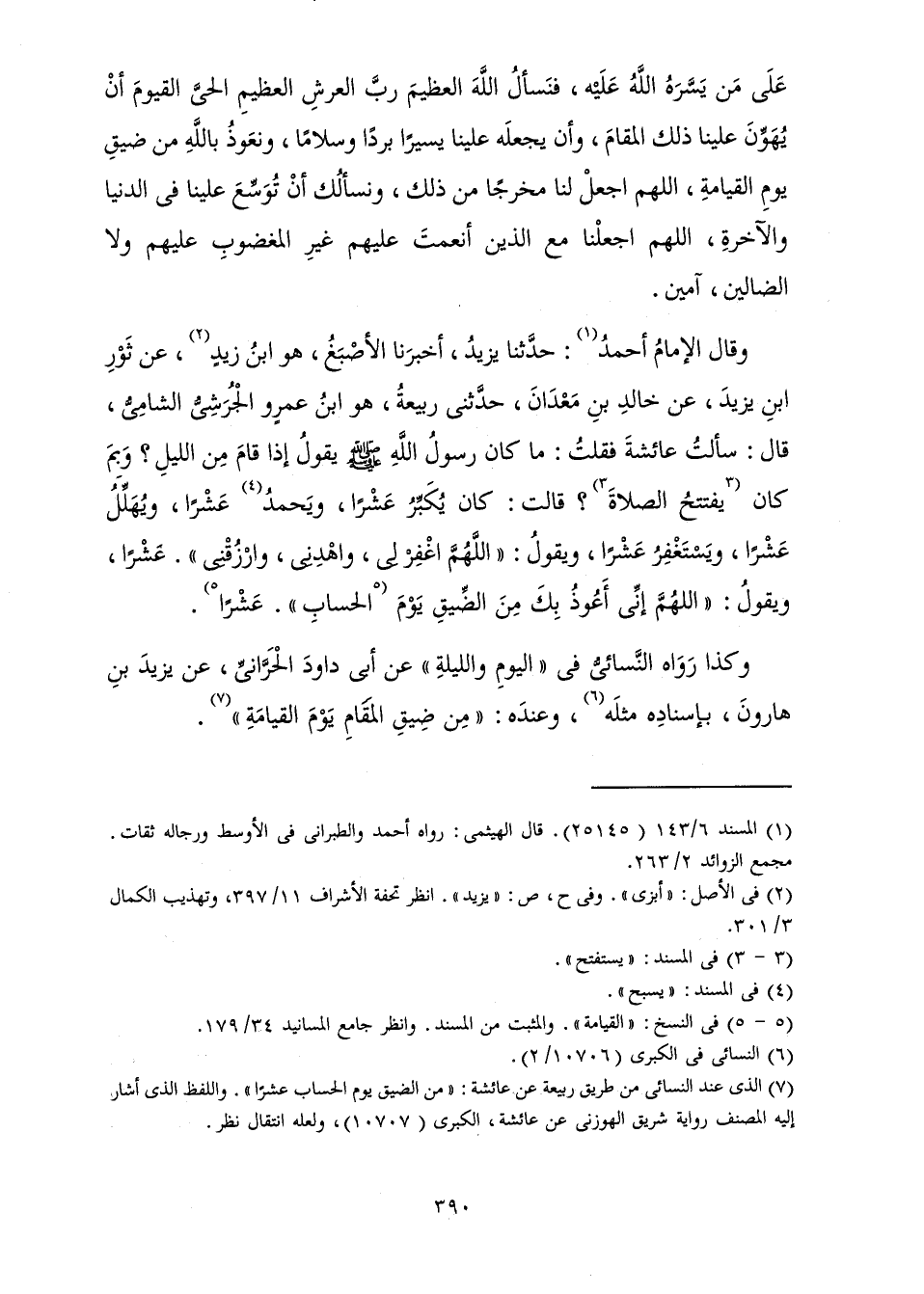 وَقَالَ الْإِمَامُ أَحْمَدُ: حَدَّثَنَا يَزِيدُ، أَخْبَرَنَا الْأَصْبَغُ، هُوَ ابْنُ زَيْدٍ، عَنْ ثَوْرِ بْنِ يَزِيدَ، عَنْ خَالِدِ بْنِ مَعْدَانَ، حَدَّثَنِي رَبِيعَةُ، هُوَ ابْنُ عَمْرٍو الْجُرَشِيُّ الشَّامِيُّ، قَالَ: «سَأَلْتُ عَائِشَةَ فَقُلْتُ: مَا كَانَ رَسُولُ اللَّهِ صَلَّى اللَّهُ عَلَيْهِ وَسَلَّمَ يَقُولُ إِذَا قَامَ مِنَ اللَّيْلِ؟ وَبِمَ كَانَ يَفْتَتِحُ الصَّلَاةَ؟ قَالَتْ: كَانَ يُكَبِّرُ عَشْرًا، وَيَحْمَدُ عَشْرًا، وَيُهَلِّلُ عَشْرًا، وَيَسْتَغْفِرُ عَشْرًا، وَيَقُولُ: " اللَّهُمَّ اغْفِرْ لِي، وَاهْدِنِي، وَارْزُقْنِي ". عَشْرًا، وَيَقُولُ: " اللَّهُمَّ إِنِّي أَعُوذُ بِكَ مِنَ الضِّيقِ يَوْمَ الْحِسَابِ ". عَشْرًا» .