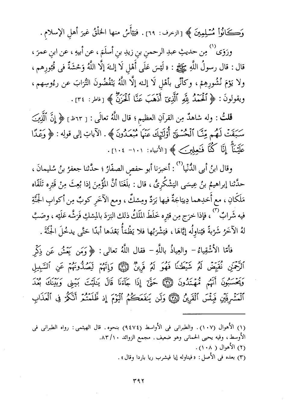 وَرَوَى مِنْ حَدِيثِ عَبْدِ الرَّحْمَنِ بْنِ زَيْدِ بْنِ أَسْلَمَ، عَنْ أَبِيهِ، عَنِ ابْنِ عُمَرَ، قَالَ: قَالَ رَسُولُ اللَّهِ صَلَّى اللَّهُ عَلَيْهِ وَسَلَّمَ: " «لَيْسَ عَلَى أَهْلِ لَا إِلَهَ إِلَّا اللَّهُ وَحْشَةٌ فِي قُبُورِهِمْ، وَلَا يَوْمَ نُشُورِهِمْ، وَكَأَنِّي بِأَهْلِ لَا إِلَهَ إِلَّا اللَّهُ يَنْفُضُونَ التُّرَابَ عَنْ رُءُوسِهِمْ، وَيَقُولُونَ: {الْحَمْدُ لِلَّهِ الَّذِي أَذْهَبَ عَنَّا الْحَزَنَ} [فاطر: 34] » [فَاطِرٍ: 34] .