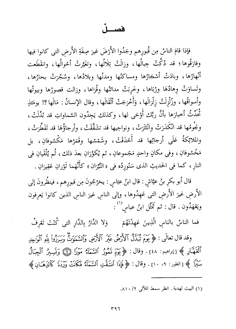 فَإِذَا قَامَ النَّاسُ مِنْ قُبُورِهِمْ وَجَدُوا الْأَرْضَ غَيْرَ صِفَةِ الْأَرْضِ الَّتِي كَانُوا فِيهَا وَفَارَقُوهَا، قَدْ دُكَّتْ جِبَالُهَا، وَزَالَتْ تِلَالُهَا، وَتَغَيَّرَتْ أَحْوَالُهَا، وَانْقَطَعَتْ أَنْهَارُهَا، وَبَادَتْ أَشْجَارُهَا، وَمَسَاكِنُهَا، وَمُدُنُهَا، وَبِلَادُهَا، وَسُجِّرَتْ بِحَارُهَا، وَتَسَاوَتْ وِهَادُهَا، وَرُبَاهَا، وَخَرِبَتْ مَدَائِنُهَا، وَقُرَاهَا، وَزَالَتْ قُصُورُهَا، وَبُيُوتُهَا، وَأَسْوَاقُهَا، وَزُلْزِلَتْ زِلْزَالَهَا، وَأَخْرَجَتْ أَثْقَالَهَا، وَقَالَ الْإِنْسَانُ: مَالَهَا؟! يَوْمَئِذٍ تُحَدِّثُ أَخْبَارَهَا بِأَنَّ رَبَّكَ أَوْحَى لَهَا، وَكَذَلِكَ يَجِدُونَ السَّمَاوَاتِ قَدْ بُدِّلَتْ، وَنُجُومُهَا قَدِ انْكَدَرَتْ وَانْتَثَرَتْ، وَنَوَاحِيهَا قَدْ تَشَقَّقَتْ، وَأَرْجَاؤُهَا قَدْ تَفَطَّرَتْ، وَالْمَلَائِكَةُ عَلَى أَرْجَائِهَا قَدْ أَحْدَقَتْ، وَشَمْسُهَا وَقَمَرُهَا مَكْسُوفَانِ، بَلْ مَخْسُوفَانِ، وَفِي مَكَانٍ وَاحِدٍ مَجْمُوعَانِ، ثُمَّ يُكَوَّرَانِ بَعْدَ ذَلِكَ، ثُمَّ يُلْقَيَانِ فِي النَّارِ، كَمَا فِي الْحَدِيثِ الَّذِي سَنُورِدُهُ فِي " النِّيرَانِ " كأَنَّهُمَا ثَوْرَانِ عَقِيرَانِ.