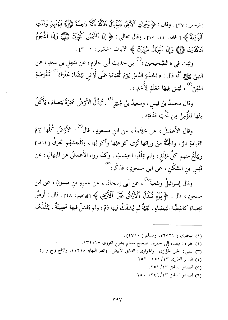 وَثَبَتَ فِي " الصَّحِيحَيْنِ " مِنْ حَدِيثِ أَبِي حَازِمٍ، عَنْ سَهْلِ بْنِ سَعْدٍ، عَنِ النَّبِيِّ صَلَّى اللَّهُ عَلَيْهِ وَسَلَّمَ أَنَّهُ قَالَ: " «يُحْشَرُ النَّاسُ يَوْمَ الْقِيَامَةِ عَلَى أَرْضٍ بَيْضَاءَ عَفْرَاءَ كَقُرْصَةِ النَّقِيِّ، لَيْسَ فِيهَا مَعْلَمٌ لِأَحَدٍ» ".