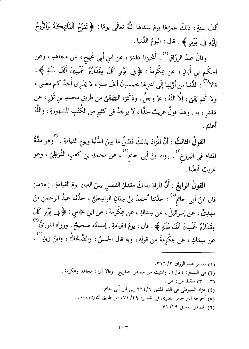 وَقَالَ عَبْدُ الرَّزَّاقِ: أَخْبَرَنَا مَعْمَرٌ، عَنِ ابْنِ أَبِي نَجِيحٍ، عَنْ مُجَاهِدٍ، وَعَنِ الْحَكَمِ بْنِ أَبَانٍ، عَنْ عِكْرِمَةَ: {فِي يَوْمٍ كَانَ مِقْدَارُهُ خَمْسِينَ أَلْفَ سَنَةٍ} [المعارج: 4] قَالَا: الدُّنْيَا مِنْ أَوَّلِهَا إِلَى آخِرِهَا خَمْسُونَ أَلْفَ سَنَةٍ، لَا يَدْرِي أَحَدٌ كَمْ مَضَى، وَلَا كَمْ بَقِيَ إِلَّا اللَّهُ، عَزَّ وَجَلَّ. وَذَكَرَهُ الْبَيْهَقِيُّ مِنْ طَرِيقِ مُحَمَّدِ بْنِ ثَوْرٍ، عَنْ مَعْمَرٍ، بِهِ. وَهَذَا قَوْلٌ غَرِيبٌ جِدًّا، لَا يُوجَدُ فِي كَثِيرٍ مِنَ الْكُتُبِ الْمَشْهُورَةِ، وَاللَّهُ أَعْلَمُ. الْقَوْلُ الثَّالِثُ: أَنَّ الْمُرَادَ بِذَلِكَ فَصْلُ مَا بَيْنَ الدُّنْيَا وَيَوْمِ الْقِيَامَةِ. وَهُوَ مُدَّةُ الْمَقَامِ فِي الْبَرْزَخِ. رَوَاهُ ابْنُ أَبِي حَاتِمٍ، عَنْ مُحَمَّدِ بْنِ كَعْبٍ الْقُرَظِيِّ، وَهُوَ غَرِيبٌ أَيْضًا.