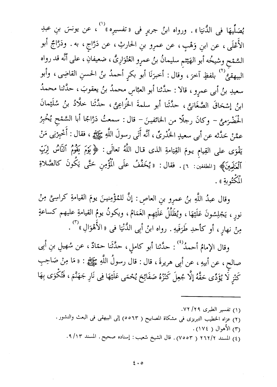 يُصَلِّيهَا فِي الدُّنْيَا» ". وَرَوَاهُ ابْنُ جَرِيرٍ فِي " تَفْسِيرِهِ "، عَنْ يُونُسَ بْنِ عَبْدِ الْأَعْلَى، عَنِ ابْنِ وَهْبٍ، عَنْ عَمْرِو بْنِ الْحَارِثِ، عَنْ دَرَّاجٍ، بِهِ. وَدَرَّاجٌ أَبُو السَّمْحِ وَشَيْخُهُ أَبُو الْهَيْثَمِ سُلَيْمَانُ بْنُ عَمْرٍو الْعُتْوَارِيُّ، ضَعِيفَانِ، عَلَى أَنَّهُ قَدْ رَوَاهُ الْبَيْهَقِيُّ بِلَفْظٍ آخَرَ، وَقَالَ: أَخْبَرَنَا أَبُو بَكْرٍ أَحْمَدُ بْنُ الْحَسَنِ الْقَاضِي، وَأَبُو سَعِيدِ بْنُ أَبِي عَمْرٍو، قَالَا: حَدَّثَنَا أَبُو الْعَبَّاسِ مُحَمَّدُ بْنُ يَعْقُوبَ، حَدَّثَنَا مُحَمَّدُ بْنُ إِسْحَاقَ الصَّغَانِيُّ، حَدَّثَنَا أَبُو سَلَمَةَ الْخُزَاعِيُّ، حَدَّثَنَا خَلَّادُ بْنُ سُلَيْمَانَ الْحَضْرَمِيُّ - وَكَانَ رَجُلًا مِنَ الْخَائِفِينَ - قَالَ: سَمِعْتُ دَرَّاجًا أَبَا السَّمْحِ يُخْبِرُ عَمَّنْ حَدَّثَهُ، عَنْ أَبِي سَعِيدٍ الْخُدْرِيِّ، أَنَّهُ «أَتَى رَسُولَ اللَّهِ صَلَّى اللَّهُ عَلَيْهِ وَسَلَّمَ، فَقَالَ: أَخْبِرْنِي مَنْ يَقْوَى عَلَى الْقِيَامِ يَوْمَ الْقِيَامَةِ الَّذِي قَالَ اللَّهُ تَعَالَى: {يَوْمَ يَقُومُ النَّاسُ لِرَبِّ الْعَالَمِينَ} [المطففين: 6] الْمُطَفِّفِينَ: 6 فَقَالَ: " يُخَفَّفُ عَلَى الْمُؤْمِنِ حَتَّى يَكُونَ كَالصَّلَاةِ الْمَكْتُوبَةِ» ".
