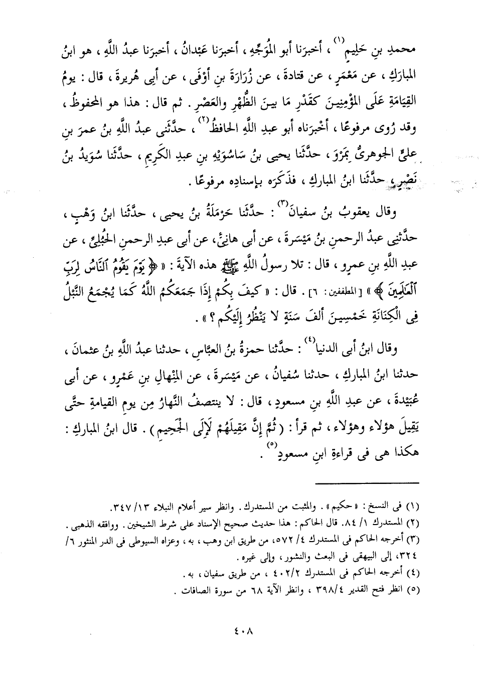 مُحَمَّدِ بْنِ حَلِيمٍ، أَخْبَرَنَا أَبُو الْمُوَجِّهِ، أَخْبَرَنَا عَبْدَانُ، أَخْبَرَنَا عَبْدُ اللَّهِ، هُوَ ابْنُ الْمُبَارَكِ، عَنْ مَعْمَرٍ، عَنْ قَتَادَةَ، عَنْ زُرَارَةَ بْنِ أَوْفَى، عَنْ أَبِي هُرَيْرَةَ، قَالَ: يَوْمُ الْقِيَامَةِ عَلَى الْمُؤْمِنِينَ كَقَدْرِ مَا بَيْنَ الظُّهْرِ وَالْعَصْرِ. ثُمَّ قَالَ: هَذَا هُوَ الْمَحْفُوظُ، وَقَدْ رُوِيَ مَرْفُوعًا، أَخْبَرَنَاهُ أَبُو عَبْدِ اللَّهِ الْحَافِظُ، حدَّثَنِي عَبْدُ اللَّهِ بْنُ عُمَرَ بْنِ عَلِيٍّ الْجَوْهَرِيُّ بِمَرْوَ، حَدَّثَنَا يَحْيَى بْنُ سَاسُوَيْهِ بْنِ عَبْدِ الْكَرِيمِ، حَدَّثَنَا سُوَيْدُ بْنُ نَصْرٍ، حَدَّثَنَا ابْنُ الْمُبَارَكِ، فَذَكَرَهُ بِإِسْنَادِهِ مَرْفُوعًا.