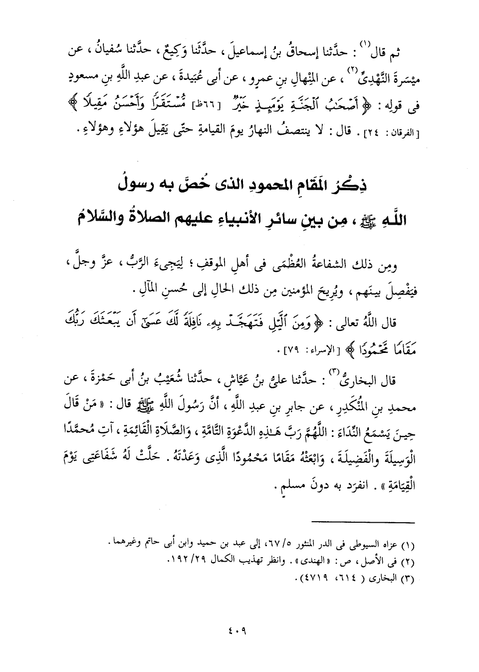 ثُمَّ قَالَ: حَدَّثَنَا إِسْحَاقُ بْنُ إِسْمَاعِيلَ، حَدَّثَنَا وَكِيعٌ، حَدَّثَنَا سُفْيَانُ، عَنْ مَيْسَرَةَ النَّهْدِيِّ، عَنِ الْمِنْهَالِ بْنِ عَمْرٍو، عَنْ أَبِي عُبَيْدَةَ، عَنْ عَبْدِ اللَّهِ بْنِ مَسْعُودٍ فِي قَوْلِهِ: [الْفُرْقَانِ: 24] . قَالَ: لَا يَنْتَصِفُ النَّهَارُ يَوْمَ الْقِيَامَةِ حَتَّى يَقِيلَ هَؤُلَاءِ وَهَؤُلَاءِ.
