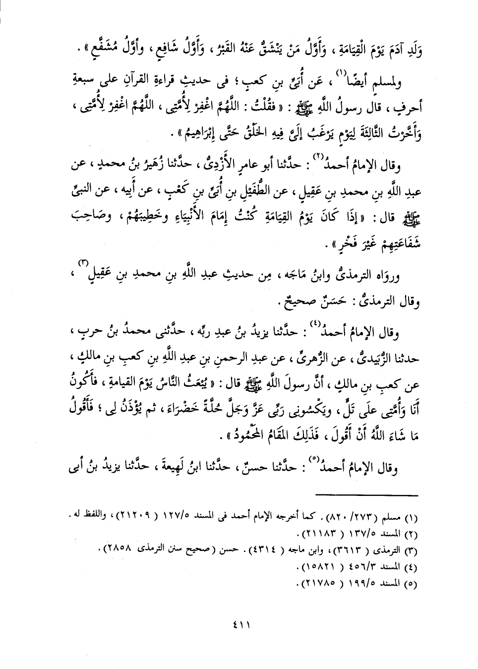 وَلَدِ آدَمَ يَوْمَ الْقِيَامَةِ، وَأَوَّلُ مَنْ يَنْشَقُّ عَنْهُ الْقَبْرُ، وَأَوَّلُ شَافِعٍ، وَأَوَّلُ مُشَفَّعٍ» ". وَلِمُسْلِمٍ أَيْضًا، عَنْ أُبَيِّ بْنِ كَعْبٍ; فِي حَدِيثِ قِرَاءَةِ الْقُرْآنِ عَلَى سَبْعَةِ أَحْرُفٍ، قَالَ رَسُولُ اللَّهِ صَلَّى اللَّهُ عَلَيْهِ وَسَلَّمَ: " «فَقُلْتُ: اللَّهُمَّ اغْفِرْ لِأُمَّتِي، اللَّهُمَّ اغْفِرْ لِأُمَّتِي، وَأَخَّرْتُ الثَّالِثَةَ لِيَوْمٍ يَرْغَبُ إِلَيَّ فِيهِ الْخَلْقُ حَتَّى إِبْرَاهِيمُ» ".