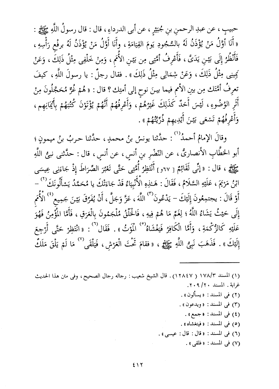 حَبِيبٍ، عَنْ عَبْدِ الرَّحْمَنِ بْنِ جُبَيْرٍ، عَنْ أَبِي الدَّرْدَاءِ، قَالَ: قَالَ رَسُولُ اللَّهِ صَلَّى اللَّهُ عَلَيْهِ وَسَلَّمَ: " «أَنَا أَوَّلُ مَنْ يُؤْذَنُ لَهُ بِالسُّجُودِ يَوْمَ الْقِيَامَةِ، وَأَنَا أَوَّلُ مَنْ يُؤْذَنُ لَهُ بِرَفْعِ رَأْسِهِ، فَأَنْظُرُ إِلَى بَيْنِ يَدَيَّ، فَأَعْرِفُ أُمَّتِي مِنْ بَيْنِ الْأُمَمِ، وَمِنْ خَلْفِي مِثْلُ ذَلِكَ، وَعَنْ يَمِينِي مِثْلُ ذَلِكَ، وَعَنْ شِمَالِي مِثْلُ ذَلِكَ ". فَقَالَ رَجُلٌ: يَا رَسُولَ اللَّهِ، كَيْفَ تَعْرِفُ أُمَّتَكَ مِنْ بَيْنِ الْأُمَمِ فِيمَا بَيْنَ نُوحٍ إِلَى أُمَّتِكِ؟ قَالَ: " هُمْ غُرٌّ مُحَجَّلُونَ مِنْ أَثَرِ الْوُضُوءِ، لَيْسَ أَحَدٌ كَذَلِكَ غَيْرُهُمْ، وَأَعْرِفُهُمْ أَنَّهُمْ يُؤْتَوْنَ كُتُبَهُمْ بِأَيْمَانِهِمْ، وَأَعْرِفُهُمْ تَسْعَى بَيْنَ أَيْدِيهِمْ ذُرِّيَّتُهُمْ» ".