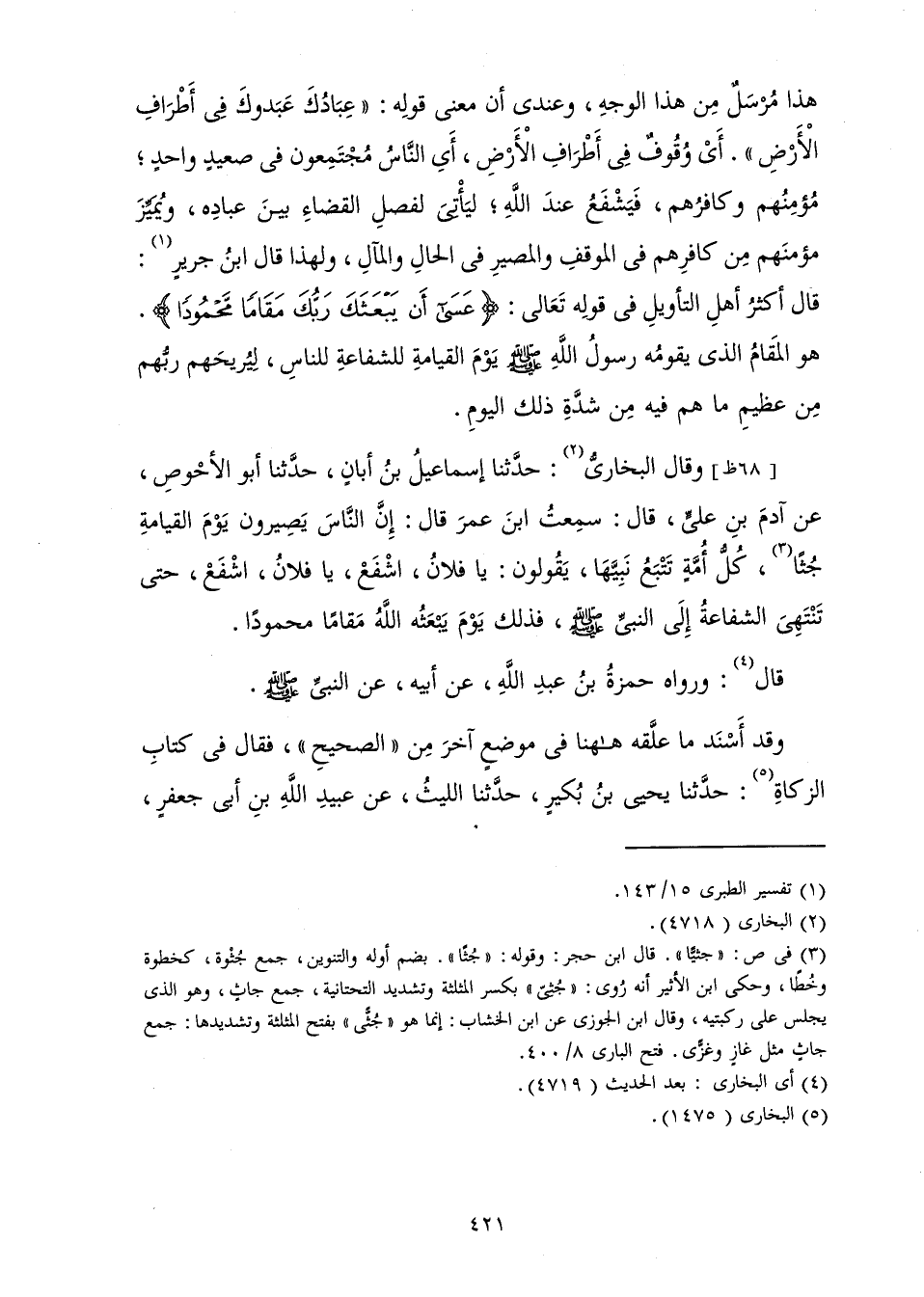 هَذَا مُرْسَلٌ مِنْ هَذَا الْوَجْهِ، وَعِنْدِي أَنَّ مَعْنَى قَوْلِهِ: " عِبَادُكَ عَبَدُوكَ فِي أَطْرَافِ الْأَرْضِ ". أَيْ وُقُوفٌ فِي أَطْرَافِ الْأَرْضِ، أَيِ النَّاسُ مُجْتَمِعُونَ فَى صَعِيدٍ وَاحِدٍ، مُؤْمِنُهُمْ وَكَافِرُهُمْ، فَيَشْفَعُ عِنْدَ اللَّهِ لِيَأْتِيَ لِفَصْلِ الْقَضَاءِ بَيْنَ عِبَادِهِ، وَيَمِيزَ مُؤْمِنَهُمْ مِنْ كَافِرِهِمْ فِي الْمَوْقِفِ وَالْمَصِيرِ فَى الْحَالِ، وَالْمَآلِ، وَلِهَذَا قَالَ ابْنُ جَرِيرٍ: قَالَ أَكْثَرُ أَهْلِ التَّأْوِيلِ فَى قَوْلِهِ تَعَالَى: {عَسَى أَنْ يَبْعَثَكَ رَبُّكَ مَقَامًا مَحْمُودًا} [الإسراء: 79] » . هُوَ الْمَقَامُ الَّذِي يَقُومُهُ رَسُولُ اللَّهِ صَلَّى اللَّهُ عَلَيْهِ وَسَلَّمَ يَوْمَ الْقِيَامَةِ لِلشَّفَاعَةِ لِلنَّاسِ، لِيُرِيحَهُمْ رَبُّهُمْ مِنْ عَظِيمِ مَا هُمْ فِيهِ مِنْ شِدَّةِ ذَلِكَ الْيَوْمِ.