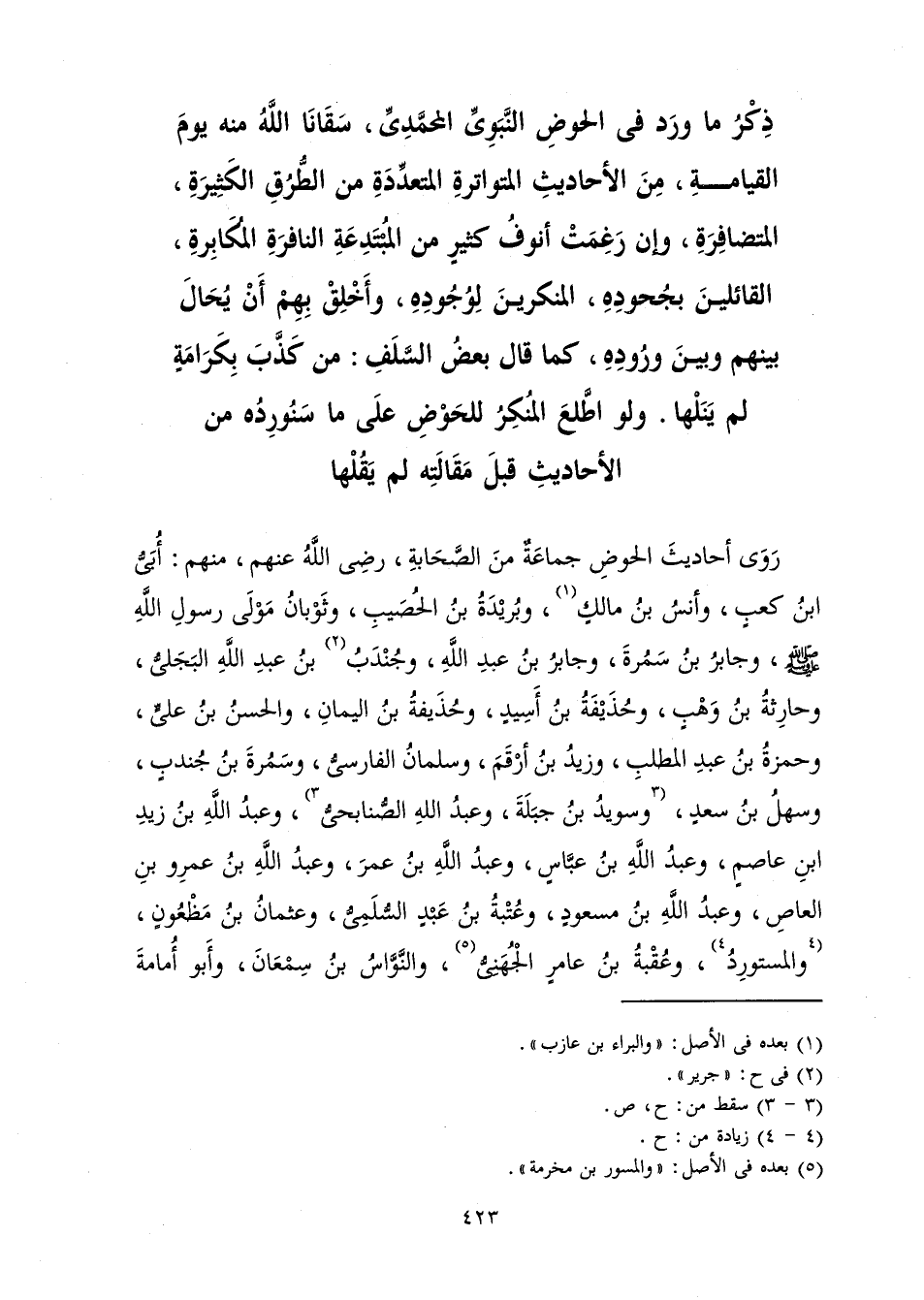 ِّ، سَقَانَا اللَّهُ مِنْهُ يَوْمَ الْقِيَامَةِ، مِنَ الْأَحَادِيثِ الْمُتَوَاتِرَةِ الْمُتَعَدِّدَةِ مِنَ الطُّرُقِ الْكَثِيرَةِ الْمُتَضَافِرَةِ، وَإِنْ رَغِمَتْ أُنُوفُ كَثِيرٍ مِنَ الْمُبْتَدِعَةِ النَّافِرَةِ الْمُكَابِرَةِ الْقَائِلِينَ بِجُحُودِهِ، الْمُنْكِرِينَ لِوُجُودِهِ، وَأَخْلِقْ بِهِمْ أَنْ يُحَالَ بَيْنَهُمْ وَبَيْنَ وُرُودِهِ، كَمَا قَالَ بَعْضُ السَّلَفِ: مَنْ كَذَّبَ بِكَرَامَةٍ لَمْ يَنَلْهَا. وَلَوِ اطَّلَعَ الْمُنْكِرُ لِلْحَوْضِ عَلَى مَا سَنُورِدُهُ مِنَ الْأَحَادِيثِ قَبْلَ مَقَالَتِهِ لَمْ يَقُلْهَا