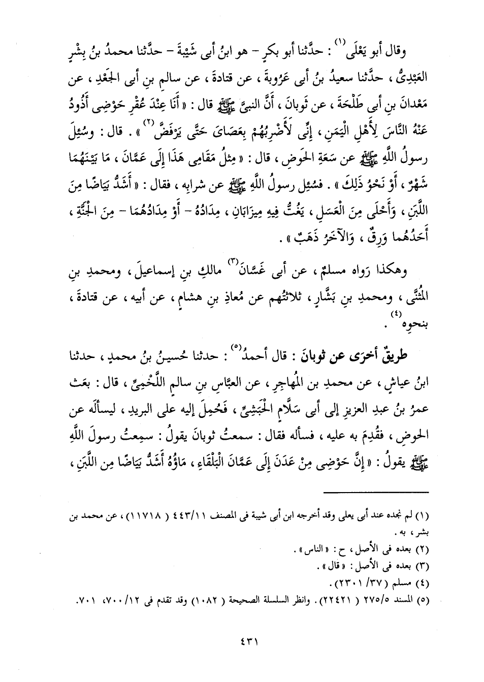 وَقَالَ أَبُو يَعْلَى: حَدَّثَنَا أَبُو بَكْرٍ - هُوَ ابْنُ أَبِي شَيْبَةَ - حَدَّثَنَا مُحَمَّدُ بْنُ بِشْرٍ الْعَبْدِيُّ، حَدَّثَنَا سَعِيدُ بْنُ أَبِي عَرُوبَةَ، عَنْ قَتَادَةَ، عَنْ سَالِمِ بْنِ أَبِي الْجَعْدِ، عَنْ مَعْدَانَ بْنِ أَبِي طَلْحَةَ، عَنْ ثَوْبَانَ، أَنَّ النَّبِيَّ صَلَّى اللَّهُ عَلَيْهِ وَسَلَّمَ قَالَ: " «أَنَا عِنْدَ عُقْرِ حَوْضِي أَذُودُ عَنْهُ النَّاسَ لِأَهْلِ الْيَمَنِ، إِنِّي لَأَضْرِبُهُمْ بِعَصَايَ حَتَّى يَرْفَضَّ ". قَالَ: وَسُئِلَ رَسُولُ اللَّهِ صَلَّى اللَّهُ عَلَيْهِ وَسَلَّمَ عَنْ سَعَةِ الْحَوْضِ، قَالَ: " مِثْلُ مَقَامِي هَذَا إِلَى عَمَّانَ، مَا بَيْنَهُمَا شَهْرٌ، أَوْ نَحْوُ ذَلِكَ ". فَسُئِلَ رَسُولُ اللَّهِ صَلَّى اللَّهُ عَلَيْهِ وَسَلَّمَ عَنْ شَرَابِهِ، فَقَالَ: " أَشَدُّ بَيَاضًا مِنَ اللَّبَنِ، وَأَحْلَى مِنَ الْعَسَلِ، يَغُتُّ فِيهِ مِيزَابَانِ، مِدَادُهُ - أَوْ مِدَادُهُمَا - مِنَ الْجَنَّةِ، أَحَدُهُمَا وَرِقٌ، وَالْآخَرُ ذَهَبٌ» ".