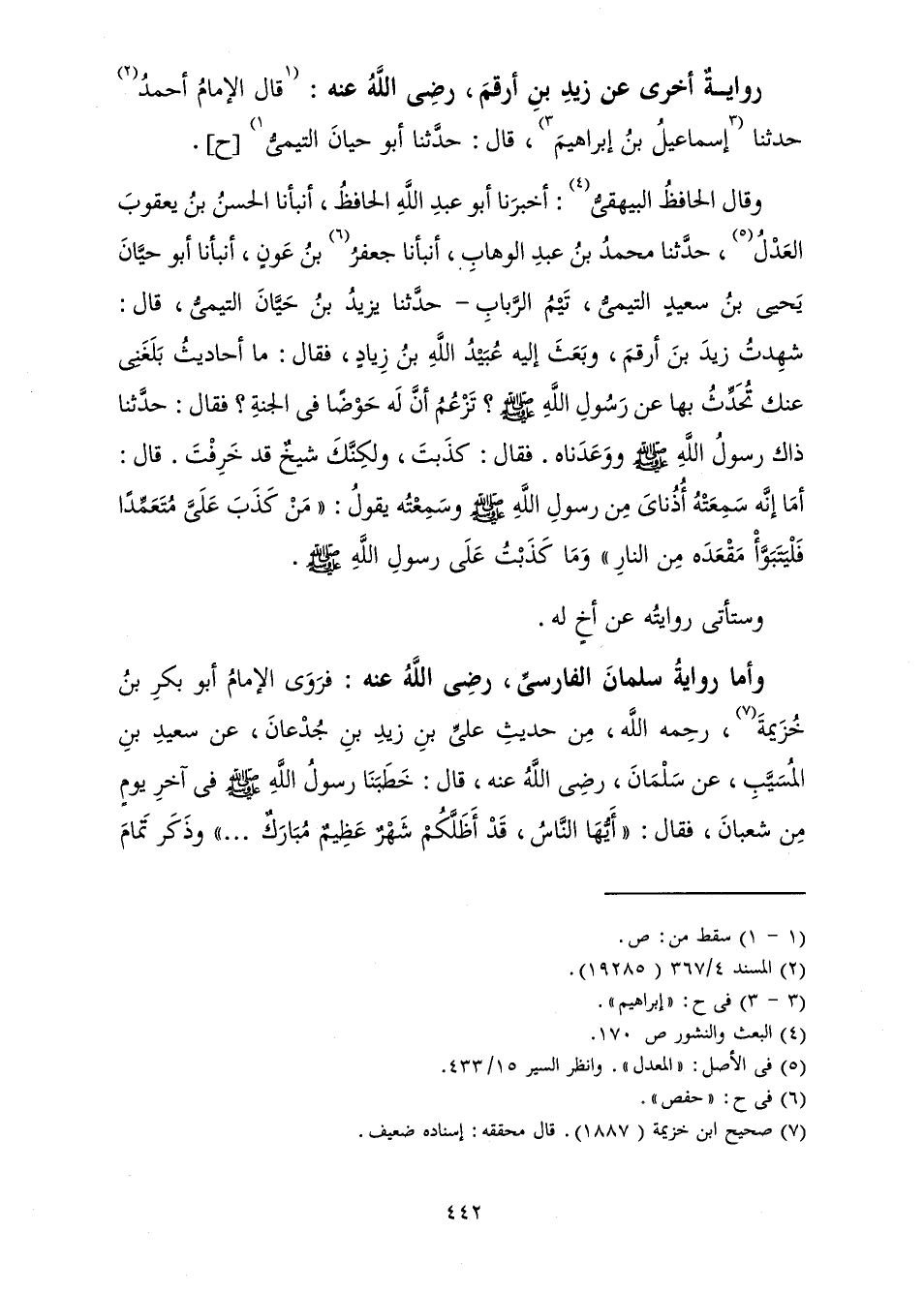 وَقَالَ الْحَافِظُ الْبَيْهَقِيُّ: أَخْبَرَنَا أَبُو عَبْدِ اللَّهِ الْحَافِظُ، أَنْبَأَنَا الْحَسَنُ بْنُ يَعْقُوبَ الْعَدْلُ، حَدَّثَنَا مُحَمَّدُ بْنُ عَبْدِ الْوَهَّابِ، أَنْبَأَنَا جَعْفَرُ بْنُ عَوْنٍ، أَنْبَأَنَا أَبُو حَيَّانَ يَحْيَى بْنُ سَعِيدٍ التَّيْمِيُّ، تَيْمُ الرَّبَابِ - حَدَّثَنَا يَزِيدُ بْنُ حَيَّانَ التَّيْمِيُّ، قَالَ: شَهِدْتُ زَيْدَ بْنَ أَرْقَمَ، وَبَعَثَ إِلَيْهِ عُبَيْدُ اللَّهِ بْنُ زِيَادٍ، فَقَالَ: مَا أَحَادِيثُ بَلَغَنِي عَنْكَ تُحَدِّثُ بِهَا عَنْ رَسُولِ اللَّهِ صَلَّى اللَّهُ عَلَيْهِ وَسَلَّمَ؟ تَزْعُمُ أَنَّ لَهُ حَوْضًا فِي الْجَنَّةِ؟ فَقَالَ: حَدَّثَنَا ذَاكَ رَسُولُ اللَّهِ صَلَّى اللَّهُ عَلَيْهِ وَسَلَّمَ وَوَعَدْنَاهُ. فَقَالَ: كَذَبْتَ، وَلَكِنَّكَ شَيْخٌ قَدْ خَرِفْتَ. قَالَ: أَمَا إِنَّهُ سَمِعَتْهُ أُذُنَايَ مِنْ رَسُولِ اللَّهِ صَلَّى اللَّهُ عَلَيْهِ وَسَلَّمَ وَسَمِعْتُهُ يَقُولُ: " «مَنْ كَذَبَ عَلَيَّ مُتَعَمِّدًا فَلْيَتَبَوَّأْ مَقْعَدَهُ مِنَ النَّارِ» " وَمَا كَذَبْتُ عَلَى رَسُولِ اللَّهِ صَلَّى اللَّهُ عَلَيْهِ وَسَلَّمَ.