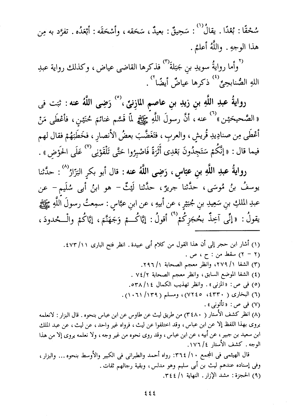 رِوَايَةُ عَبْدِ اللَّهِ بْنِ زَيْدِ بْنِ عَاصِمِ الْمَازِنِيِّ، رَضِيَ اللَّهُ عَنْهُ: ثَبَتَ فِي " الصَّحِيحَيْنِ " عَنْهُ، «أَنَّ رَسُولَ اللَّهِ صَلَّى اللَّهُ عَلَيْهِ وَسَلَّمَ لَمَّا قَسَّمَ غَنَائِمَ حُنَيْنٍ، فَأَعْطَى مَنْ أَعْطَى مِنْ صَنَادِيدِ قُرَيْشٍ، وَالْعَرَبِ، فَتَغَضَّبَ بَعْضُ الْأَنْصَارِ، فَخَطَبَهُمْ، فَقَالَ لَهُمْ فِيمَا قَالَ: " إِنَّكُمْ سَتَجِدُونَ بَعْدِي أَثَرَةً فَاصْبِرُوا حَتَّى تَلْقَوْنِي عَلَى الْحَوْضِ» ".