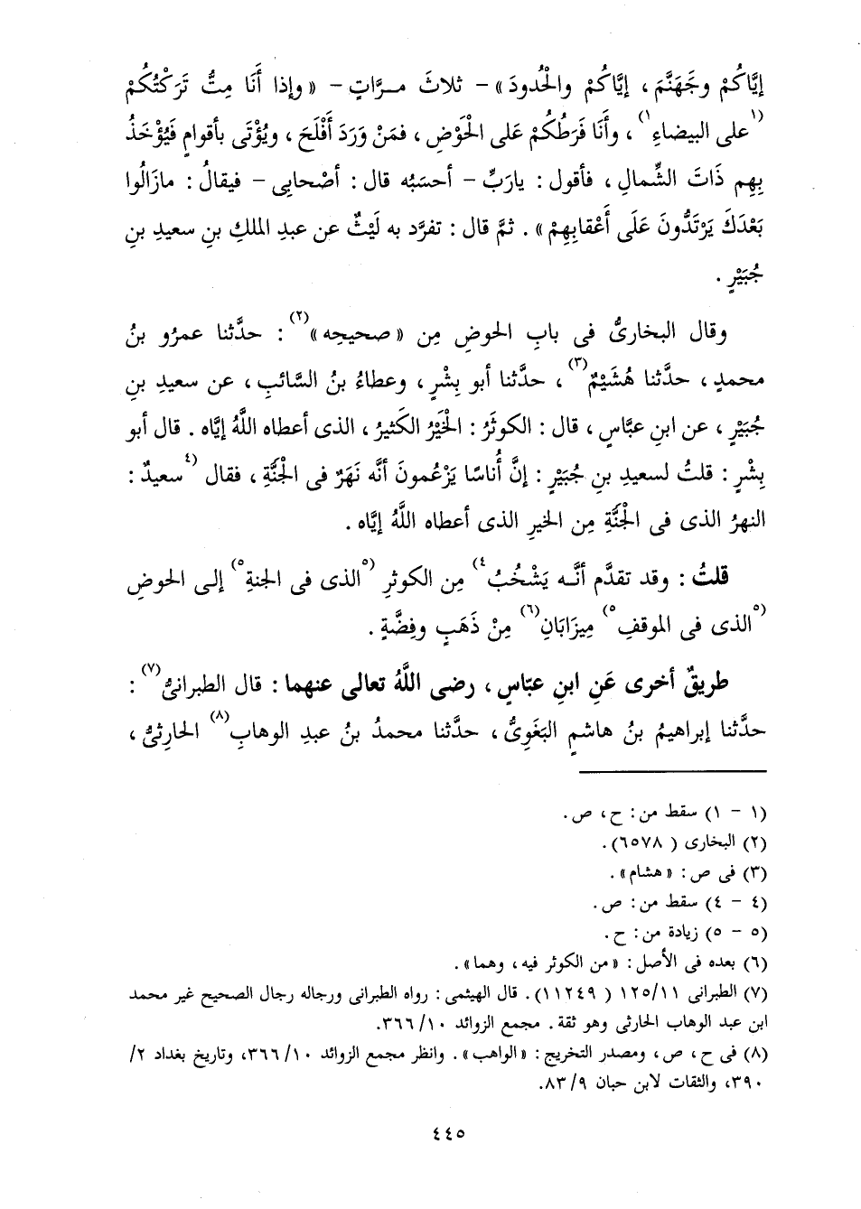 وَقَالَ الْبُخَارِيُّ فِي بَابِ الْحَوْضِ مِنْ " صَحِيحِهِ ": حَدَّثَنَا عَمْرُو بْنُ مُحَمَّدٍ، حَدَّثَنَا هُشَيْمٌ، حَدَّثَنَا أَبُو بِشْرٍ، وَعَطَاءُ بْنُ السَّائِبِ، عَنْ سَعِيدِ بْنِ جُبَيْرٍ، عَنِ ابْنِ عَبَّاسٍ، قَالَ: الْكَوْثَرُ: الْخَيْرُ الْكَثِيرُ الَّذِي أَعْطَاهُ اللَّهُ إِيَّاهُ. قَالَ أَبُو بِشْرٍ: قُلْتُ لِسَعِيدِ بْنِ جُبَيْرٍ: إِنَّ أُنَاسًا يَزْعُمُونَ أَنَّهُ نَهَرٌ فِي الْجَنَّةِ، فَقَالَ سَعِيدٌ: النَّهْرُ الَّذِي فِي الْجَنَّةِ مِنَ الْخَيْرِ الَّذِي أَعْطَاهُ اللَّهُ إِيَّاهُ.