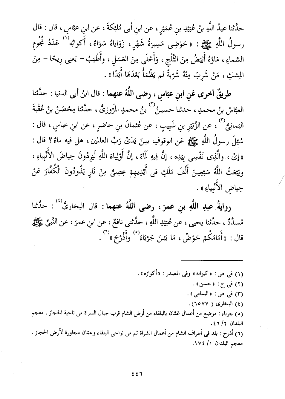 رِوَايَةُ عَبْدِ اللَّهِ بْنِ عُمَرَ، رَضِيَ اللَّهُ عَنْهُمَا: قَالَ الْبُخَارِيُّ: حَدَّثَنَا مُسَدَّدٌ، حَدَّثَنَا يَحْيَى، عَنْ عُبَيْدِ اللَّهِ، حَدَّثَنِي نَافِعٌ، عَنِ ابْنِ عُمَرَ، عَنِ النَّبِيِّ صَلَّى اللَّهُ عَلَيْهِ وَسَلَّمَ، قَالَ: " «أَمَامَكُمْ حَوْضٌ، مَا بَيْنَ جَرْبَاءَ وَأَذْرُحَ» ".