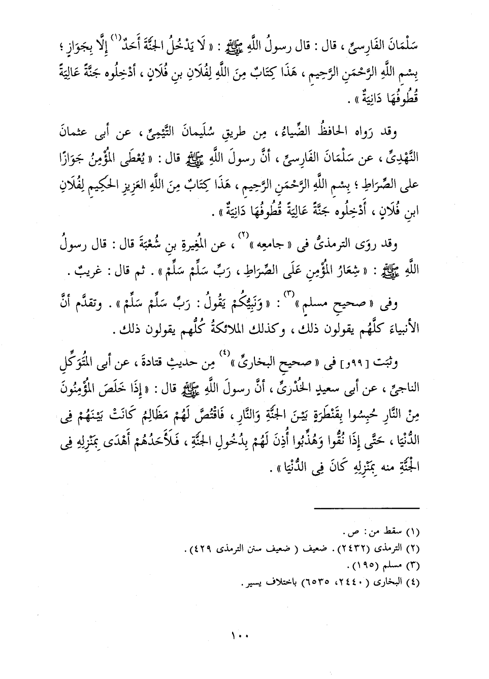 سَلْمَانَ الْفَارِسِيِّ، قَالَ: قَالَ رَسُولُ اللَّهِ صَلَّى اللَّهُ عَلَيْهِ وَسَلَّمَ: " «لَا يَدْخُلُ الْجَنَّةَ أَحَدٌ إِلَّا بِجَوَازٍ ; بِسْمِ اللَّهِ الرَّحْمَنِ الرَّحِيمِ، هَذَا كِتَابٌ مِنَ اللَّهِ لِفُلَانِ بْنِ فُلَانٍ، أَدْخِلُوهُ جَنَّةً عَالِيَةً قُطُوفُهَا دَانِيَةٌ» ".