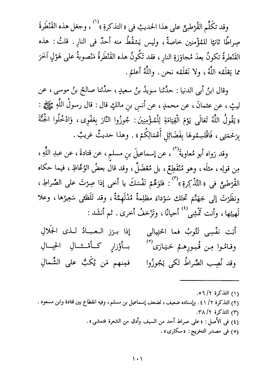 وَقَدْ نُصِبَ الصِّرَاطُ لِكَيْ يَجُوزُوا ... فَمِنْهُمْ مَنْ يُكَبُّ عَلَى الشِّمَالِ
