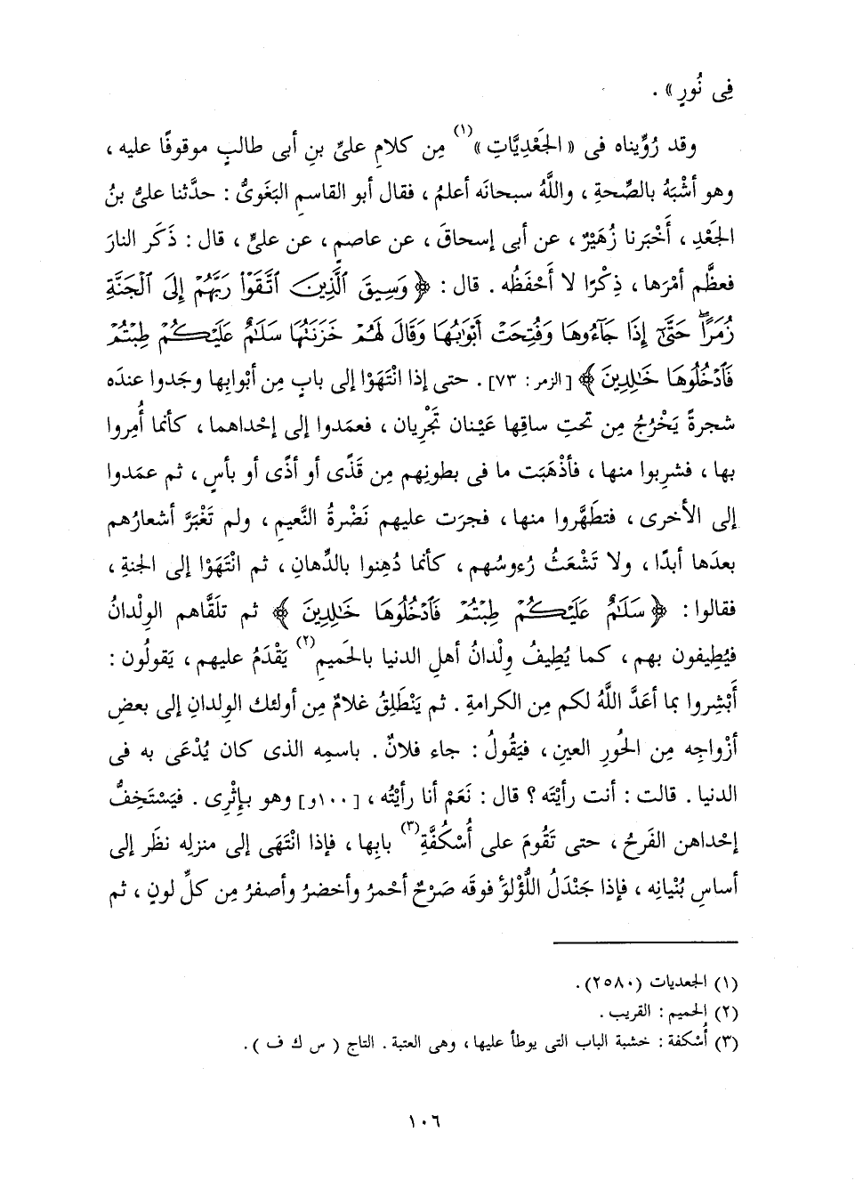 . وَقَدْ رُوِّينَاهُ فِي " الْجَعْدِيَّاتِ " مِنْ كَلَامِ عَلِيِّ بْنِ أَبِي طَالِبٍ مَوْقُوفًا عَلَيْهِ، وَهُوَ أَشْبَهُ بِالصِّحَّةِ، وَاللَّهُ سُبْحَانَهُ أَعْلَمُ، فَقَالَ أَبُو الْقَاسِمِ الْبَغَوِيُّ: حَدَّثَنَا عَلِيُّ بْنُ الْجَعْدِ، أَخْبَرَنَا زُهَيْرٌ، عَنْ أَبِي إِسْحَاقَ، عَنْ عَاصِمٍ، عَنْ عَلِيٍّ، قَالَ: ذَكَرَ النَّارَ فَعَظَّمَ أَمْرَهَا، ذِكْرًا لَا أَحْفَظُهُ. قَالَ: {وَسِيقَ الَّذِينَ اتَّقَوْا رَبَّهُمْ إِلَى الْجَنَّةِ زُمَرًا حَتَّى إِذَا جَاءُوهَا وَفُتِحَتْ أَبْوَابُهَا وَقَالَ لَهُمْ خَزَنَتُهَا سَلَامٌ عَلَيْكُمْ طِبْتُمْ فَادْخُلُوهَا خَالِدِينَ} [الزمر: 73] . حَتَّى إِذَا انْتَهَوْا إِلَى بَابٍ مِنْ أَبْوَابِهَا وَجَدُوا عِنْدَهُ شَجَرَةً يَخْرُجُ مِنْ تَحْتِ سَاقِهَا عَيْنَانِ تَجْرِيَانِ، فَعَمَدُوا إِلَى إِحْدَاهُمَا، كَأَنَّمَا أُمِرُوا بِهَا، فَشَرِبُوا مِنْهَا، فَأَذْهَبَتْ مَا فِي بُطُونِهِمْ مِنْ قَذًى أَوْ أَذًى أَوْ بَأْسٍ، ثُمَّ عَمَدُوا إِلَى الْأُخْرَى، فَتَطَهَّرُوا مِنْهَا، فَجَرَتْ عَلَيْهِمْ نَضْرَةُ النَّعِيمِ، وَلَمْ تَغْبَرَّ أَشْعَارُهُمْ بَعْدَهَا أَبَدًا، وَلَا تَشْعَثُ رُءُوسُهُمْ، كَأَنَّمَا دُهِنُوا بِالدِّهَانِ، ثُمَّ انْتَهَوْا إِلَى الْجَنَّةِ، فَقَالُوا: {سَلَامٌ عَلَيْكُمْ طِبْتُمْ فَادْخُلُوهَا خَالِدِينَ} [الزمر: 73] ثُمَّ تَلَقَّاهُمُ الْوِلْدَانُ فَيُطِيفُونَ بِهِمْ، كَمَا يُطِيفُ وِلْدَانُ أَهْلِ الدُّنْيَا بِالْحَمِيمِ يَقْدَمُ عَلَيْهِمْ، يَقُولُونَ: أَبْشِرُوا بِمَا أَعَدَّ اللَّهُ لَكُمْ مِنَ الْكَرَامَةِ. ثُمَّ يَنْطَلِقُ غُلَامٌ مِنْ أُولَئِكَ الْوِلْدَانِ إِلَى بَعْضِ أَزْوَاجِهِ مِنَ الْحُورِ الْعِينِ، فَيَقُولُ: جَاءَ فُلَانٌ. بِاسْمِهِ الَّذِي كَانَ يُدْعَى بِهِ فِي الدُّنْيَا. قَالَتْ: أَمَا رَأَيْتَهُ؟ قَالَ: نَعَمْ أَنَا رَأَيْتُهُ، وَهُوَ بِإِثْرِي. فَيَسْتَخِفُّ إِحْدَاهُنَّ الْفَرَحُ، حَتَّى تَقُومَ عَلَى أُسْكُفَّةِ بَابِهَا، فَإِذَا انْتَهَى إِلَى مَنْزِلِهِ نَظَرَ إِلَى أَسَاسِ بُنْيَانِهِ، فَإِذَا جَنْدَلُ اللُّؤْلُؤِ فَوْقَهُ صَرْحٌ أَحْمَرُ وَأَخْضَرُ وَأَصْفَرُ مِنْ كُلِّ لَوْنٍ، ثُمَّ