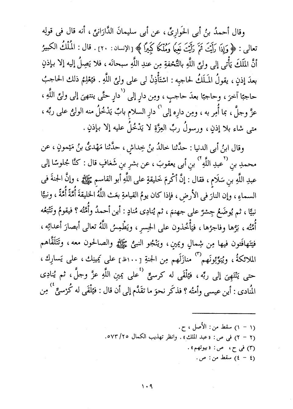 وَقَالَ أَحْمَدُ بْنُ أَبِي الْحَوَارِيِّ، عَنْ أَبِي سُلَيْمَانَ الدَّارَانِيِّ، أَنَّهُ قَالَ فِي قَوْلِهِ تَعَالَى: {وَإِذَا رَأَيْتَ ثَمَّ رَأَيْتَ نَعِيمًا وَمُلْكًا كَبِيرًا} [الإنسان: 20] ، قَالَ: الْمُلْكُ الْكَبِيرُ أَنَّ الْمَلَكَ يَأْتِي إِلَى وَلِيِّ اللَّهِ بِالتُّحْفَةِ مِنْ عِنْدِ اللَّهِ سُبْحَانَهُ، فَلَا يَصِلُ إِلَيْهِ إِلَّا بِإِذْنٍ بَعْدَ إِذْنٍ، يَقُولُ الْمَلَكُ لِحَاجِبِهِ: اسْتَأْذِنْ لِي عَلَى وَلِيِّ اللَّهِ. فَيُعْلِمُ ذَلِكَ الْحَاجِبُ حَاجِبًا آخَرَ، وَحَاجِبًا بَعْدَ حَاجِبٍ، وَمِنْ دَارٍ إِلَى دَارٍ حَتَّى يَنْتَهِيَ إِلَى وَلِيِّ اللَّهِ، عَزَّ وَجَلَّ، بِمَا أُمِرَ بِهِ، وَمِنْ دَارِهِ إِلَى دَارِ السَّلَامِ بَابٌ يَدْخُلُ مِنْهُ الْوَلِيُّ عَلَى رَبِّهِ، مَتَى شَاءَ بِلَا إِذْنٍ، وَرَسُولُ رَبِّ الْعِزَّةِ لَا يَدْخُلُ عَلَيْهِ إِلَّا بِإِذْنٍ.
