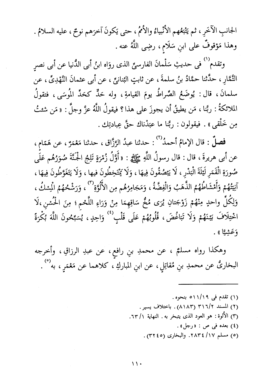 فَصْلٌ: قَالَ الْإِمَامُ أَحْمَدُ: حَدَّثَنَا عَبْدُ الرَّزَّاقِ، حَدَّثَنَا مَعْمَرٌ، عَنْ هَمَّامٍ، عَنْ أَبِي هُرَيْرَةَ، قَالَ: قَالَ رَسُولُ اللَّهِ صَلَّى اللَّهُ عَلَيْهِ وَسَلَّمَ: " «أَوَّلُ زُمْرَةٍ تَلِجُ الْجَنَّةَ صُوَرُهُمْ عَلَى صُورَةِ الْقَمَرِ لَيْلَةَ الْبَدْرِ، لَا يَبْصُقُونَ فِيهَا، وَلَا يَمْتَخِطُونَ فِيهَا، وَلَا يَتَغَوَّطُونَ فِيهَا، آنِيَتُهُمْ وَأَمْشَاطُهُمُ الذَّهَبُ وَالْفِضَّةُ، وَمَجَامِرُهُمْ مِنَ الْأَلُوَّةِ، وَرَشْحُهُمُ الْمِسْكُ، وَلِكُلِّ وَاحِدٍ مِنْهُمْ زَوْجَتَانِ يُرَى مُخُّ سَاقِهِمَا مِنْ وَرَاءِ اللَّحْمِ ; مِنَ الْحُسْنِ، لَا اخْتِلَافَ بَيْنَهُمْ وَلَا تَبَاغُضَ، قُلُوبُهُمْ عَلَى قَلْبٍ وَاحِدٍ، يُسَبِّحُونَ اللَّهَ بُكْرَةً وَعَشِيًّا» ".