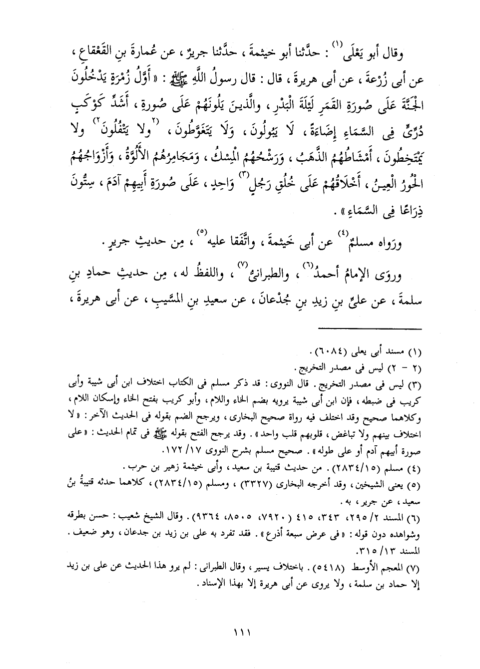 وَقَالَ أَبُو يَعْلَى: حَدَّثَنَا أَبُو خَيْثَمَةَ، حَدَّثَنَا جَرِيرٌ، عَنْ عُمَارَةَ بْنِ الْقَعْقَاعِ، عَنْ أَبِي زُرْعَةَ، عَنْ أَبِي هُرَيْرَةَ، قَالَ: قَالَ رَسُولُ اللَّهِ صَلَّى اللَّهُ عَلَيْهِ وَسَلَّمَ: " «أَوَّلُ زُمْرَةٍ يَدْخُلُونَ الْجَنَّةَ عَلَى صُورَةِ الْقَمَرِ لَيْلَةَ الْبَدْرِ، وَالَّذِينَ يَلُونَهُمْ عَلَى صُورَةِ أَشَدِّ كَوْكَبٍ دُرِّيٍّ فِي السَّمَاءِ إِضَاءَةً، لَا يَبُولُونَ، وَلَا يَتَغَوَّطُونَ، وَلَا يَتْفُلُونَ وَلَا يَمْتَخِطُونُ، أَمَشْاطُهُمُ الذَّهَبُ، وَرَشْحُهُمُ الْمِسْكُ، وَمَجَامِرُهُمُ الْأَلُوَّةُ، وَأَزْوَاجُهُمُ الْحُورُ الْعِينُ، أَخْلَاقُهُمْ عَلَى خُلُقِ رَجُلٍ وَاحِدٍ، عَلَى صُورَةِ أَبِيهِمْ آدَمَ، سِتُّونَ ذِرَاعًا فِي السَّمَاءِ» ".