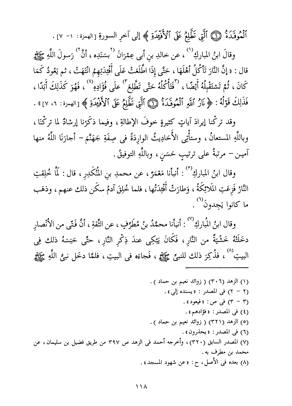 وَقَالَ ابْنُ الْمُبَارَكِ، عَنْ خَالِدِ بْنِ أَبِي عِمْرَانَ بِسَنَدِهِ، أَنَّ رَسُولَ اللَّهِ صَلَّى اللَّهُ عَلَيْهِ وَسَلَّمَ قَالَ: " «إِنَّ النَّارَ تَأْكُلُ أَهْلَهَا، حَتَّى إِذَا اطَّلَعَتْ عَلَى أَفْئِدَتِهِمُ انْتَهَتْ، ثُمَّ يَعُودُ كَمَا كَانَ، ثُمَّ تَسْتَقْبِلُهُ أَيْضًا، فَتَأْكُلُهُ حَتَّى تَطَّلِعَ عَلَى فُؤَادِهِ، فَهُوَ كَذَلِكَ أَبَدًا، فَذَلِكَ قَوْلُهُ: {نَارُ اللَّهِ الْمُوقَدَةُ الَّتِي تَطَّلِعُ عَلَى الْأَفْئِدَةِ} [الهمزة: 6] » [الْهُمَزَةِ: 6، 7] .