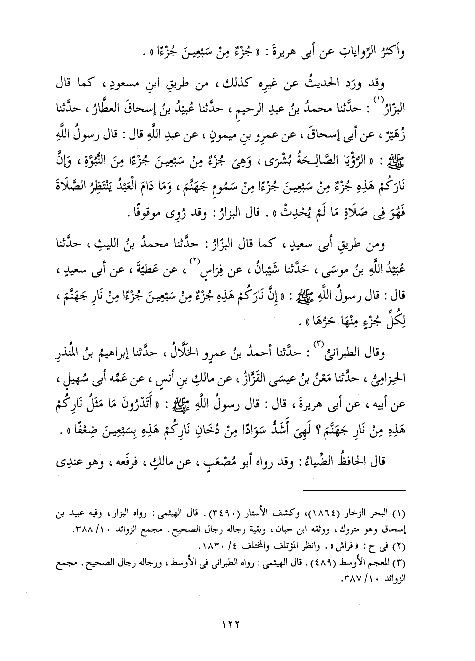 وَقَدْ وَرَدَ الْحَدِيثُ عَنْ غَيْرِهِ كَذَلِكَ، مِنْ طَرِيقِ ابْنِ مَسْعُودٍ، كَمَا قَالَ الْبَزَّارُ: حَدَّثَنَا مُحَمَّدُ بْنُ عَبْدِ الرَّحِيمِ، حَدَّثَنَا عُبَيْدُ بْنُ إِسْحَاقَ الْعَطَّارُ، حَدَّثَنَا زُهَيْرٌ، عَنْ أَبِي إِسْحَاقَ، عَنْ عَمْرِو بْنِ مَيْمُونٍ، عَنْ عَبْدِ اللَّهِ قَالَ: قَالَ رَسُولُ اللَّهِ صَلَّى اللَّهُ عَلَيْهِ وَسَلَّمَ: " «الرُّؤْيَا الصَّالِحَةُ بُشْرَى، وَهَى جُزْءٌ مِنْ سَبْعِينَ جُزْءًا مِنَ النُّبُوَّةِ، وَإِنَّ نَارَكُمْ هَذِهِ جُزْءٌ مِنْ سَبْعِينَ جُزْءًا مِنْ سُمُومِ جَهَنَّمَ، وَمَا دَامَ الْعَبْدُ يَنْتَظِرُ الصَّلَاةَ فَهُوَ فِي صَلَاةٍ مَا لَمْ يُحْدِثْ» ". قَالَ الْبَزَّارُ: وَقَدْ رُوِيَ مَوْقُوفًا.