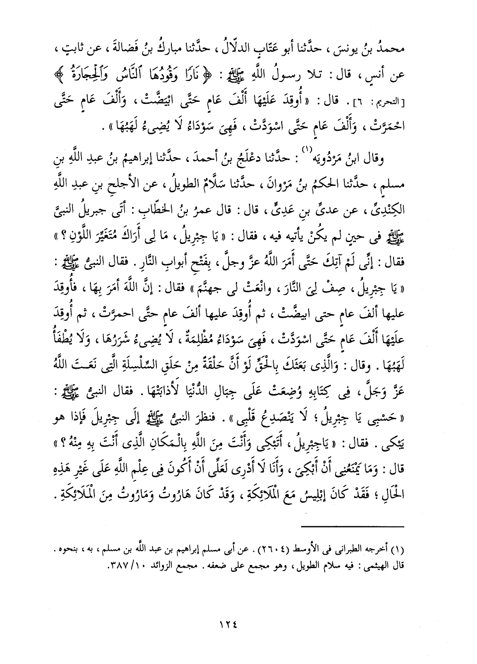وَقَالَ ابْنُ مَرْدَوَيْهِ: حَدَّثَنَا دَعْلَجُ بْنُ أَحْمَدَ، حَدَّثَنَا إِبْرَاهِيمُ بْنُ عَبْدِ اللَّهِ بْنِ مُسْلِمٍ، حَدَّثَنَا الْحَكَمُ بْنُ مَرْوَانَ، حَدَّثَنَا سَلَّامٌ الطَّوِيلُ، عَنِ الْأَجْلَحِ بْنِ عَبْدِ اللَّهِ الْكِنْدِيُّ، عَنْ عَدِيِّ بْنِ عَدِيٍّ، قَالَ: قَالَ عُمَرُ بْنُ الْخَطَّابِ: «أَتَى جِبْرِيلُ النَّبِيَّ صَلَّى اللَّهُ عَلَيْهِ وَسَلَّمَ فِي حِينٍ لَمْ يَكُنْ يَأْتِيهِ فِيهِ، فَقَالَ: " يَا جِبْرِيلُ، مَا لِي أَرَاكَ مُتَغَيِّرَ اللَّوْنِ؟ " فَقَالَ: إِنِّي لَمْ آتِكَ حَتَّى أَمَرَ اللَّهُ عَزَّ وَجَلَّ، بِفَتْحِ أَبْوَابِ النَّارِ. فَقَالَ النَّبِيُّ صَلَّى اللَّهُ عَلَيْهِ وَسَلَّمَ: " يَا جِبْرِيلُ، صِفْ لِيَ النَّارَ، وَانْعَتْ لِي جَهَنَّمَ " فَقَالَ: إِنَّ اللَّهَ أَمَرَ بِهَا، فَأُوقِدَ عَلَيْهَا أَلْفَ عَامٍ حَتَّى ابْيَضَّتْ، ثُمَّ أُوقِدَ عَلَيْهَا أَلْفَ عَامٍ حَتَّى احْمَرَّتْ، ثُمَّ أُوقِدَ عَلَيْهَا أَلْفَ عَامٍ حَتَّى اسْوَدَّتْ، فَهِيَ سَوْدَاءُ مُظْلِمَةٌ، لَا يُضِيءُ شَرَرُهَا، وَلَا يُطْفَأُ لَهَبُهَا. وَقَالَ: وَالَّذِي بَعَثَكَ بِالْحَقِّ لَوْ أَنَّ حَلْقَةً مِنْ حَلَقِ السِّلْسِلَةِ الَّتِي نَعَتَ اللَّهُ عَزَّ وَجَلَّ، فِي كِتَابِهِ وُضِعَتْ عَلَى جِبَالِ الدُّنْيَا لَأَذَابَتْهَا. فَقَالَ النَّبِيُّ صَلَّى اللَّهُ عَلَيْهِ وَسَلَّمَ: " حَسْبِي يَا جِبْرِيلُ ; لَا يَنْصَدِعُ قَلْبِي ". فَنَظَرَ النَّبِيُّ صَلَّى اللَّهُ عَلَيْهِ وَسَلَّمَ إِلَى جِبْرِيلَ فَإِذَا هُوَ يَبْكِي. فَقَالَ: " يَا جِبْرِيلُ، أَتَبْكِي وَأَنْتَ مِنَ اللَّهِ بِالْمَكَانِ الَّذِي أَنْتَ بِهِ مِنْهُ؟ " قَالَ: وَمَا يَمْنَعُنِي أَنْ أَبْكِيَ، وَأَنَا لَا أَدْرِي لَعَلِّي أَنْ أَكُونَ فِي عِلْمِ اللَّهِ عَلَى غَيْرِ هَذِهِ الْحَالِ؟ فَقَدْ كَانَ إِبْلِيسُ مَعَ الْمَلَائِكَةِ، وَقَدْ كَانَ هَارُوتُ وَمَارُوتُ مِنَ الْمَلَائِكَةِ.