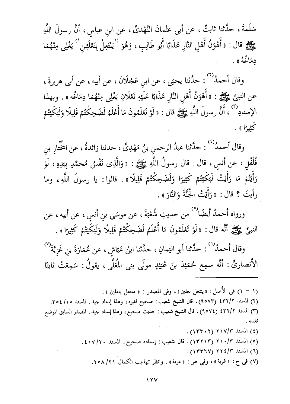 وَقَالَ أَحْمَدُ: حَدَّثَنَا يَحْيَى، عَنِ ابْنِ عَجْلَانِ، عَنْ أَبِيهِ، عَنْ أَبِي هُرَيْرَةَ، عَنِ النَّبِيِّ صَلَّى اللَّهُ عَلَيْهِ وَسَلَّمَ " «أَهْوَنُ أَهْلِ النَّارِ عَذَابًا عَلَيْهِ نَعْلَانِ يَغْلِي مِنْهُمَا دِمَاغُهُ» ". وَبِهَذَا الْإِسْنَادِ، أَنَّ رَسُولَ اللَّهِ صَلَّى اللَّهُ عَلَيْهِ وَسَلَّمَ قَالَ: " «لَوْ تَعْلَمُونَ مَا أَعْلَمُ لَضَحِكْتُمْ قَلِيلًا وَبَكَيْتُمْ كَثِيرًا» ".