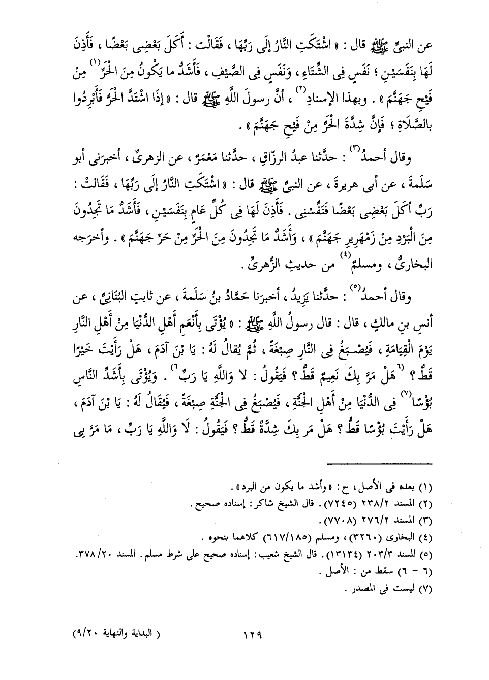 عَنِ النَّبِيِّ صَلَّى اللَّهُ عَلَيْهِ وَسَلَّمَ قَالَ: " «اشْتَكَتِ النَّارُ إِلَى رَبِّهَا، فَقَالَتْ: أَكَلَ بَعْضِي بَعْضًا، فَأَذِنَ لَهَا بِنَفَسَيْنِ ; نَفَسٍ فِي الشِّتَاءِ، وَنَفَسٍ فِي الصَّيْفِ، فَأَشَدُّ مَا يَكُونُ مِنَ الْحَرِّ مِنْ فَيْحِ جَهَنَّمَ» ". وَبِهَذَا الْإِسْنَادِ، أَنَّ رَسُولَ اللَّهِ صَلَّى اللَّهُ عَلَيْهِ وَسَلَّمَ قَالَ: " «إِذَا اشْتَدَّ الْحَرُّ فَأَبْرِدُوا بِالصَّلَاةِ؟ فَإِنَّ شِدَّةَ الْحَرِّ مِنْ فَيْحِ جَهَنَّمَ» ".