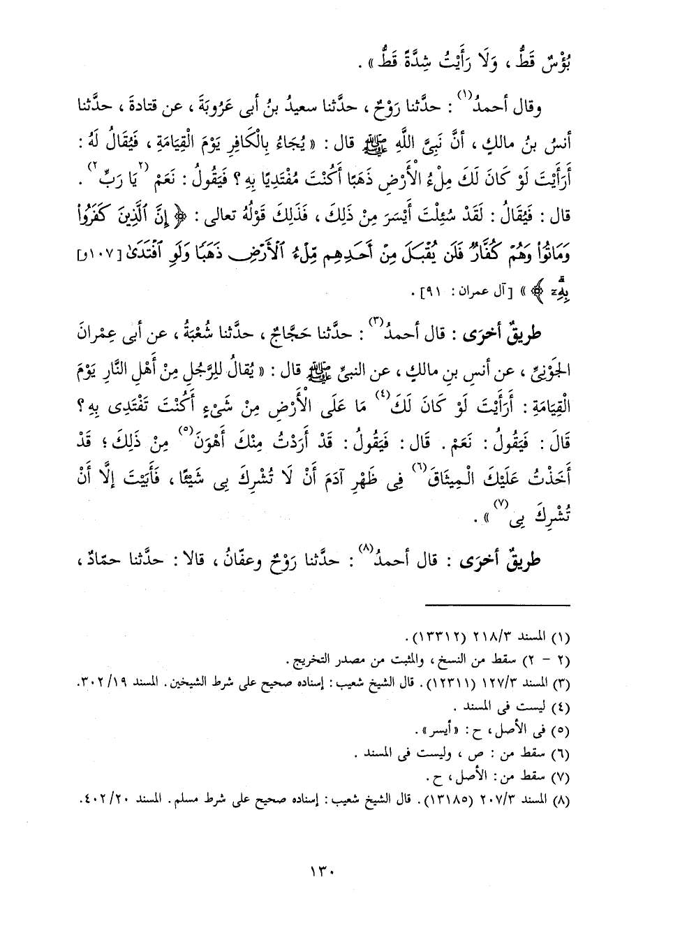 وَقَالَ أَحْمَدُ: حَدَّثَنَا رَوْحٌ، حَدَّثَنَا سَعِيدُ بْنُ أَبِي عَرُوبَةَ، عَنْ قَتَادَةَ، حَدَّثَنَا أَنَسُ بْنُ مَالِكٍ، أَنَّ نَبِيَّ اللَّهِ صَلَّى اللَّهُ عَلَيْهِ وَسَلَّمَ قَالَ: " «يُجَاءُ بِالْكَافِرِ يَوْمَ الْقِيَامَةِ، فَيُقَالُ لَهُ: أَرَأَيْتَ لَوْ كَانَ لَكَ مِلْءُ الْأَرْضِ ذَهَبَا أَكُنْتَ مُفْتَدِيًا بِهِ؟ فَيَقُولُ: نَعَمْ يَا رَبِّ. قَالَ: فَيُقَالُ: لَقَدْ سُئِلْتَ أَيْسَرَ مِنْ ذَلِكَ، فَذَلِكَ قَوْلُهُ تَعَالَى: {إِنَّ الَّذِينَ كَفَرُوا وَمَاتُوا وَهُمْ كُفَّارٌ فَلَنْ يُقْبَلَ مِنْ أَحَدِهِمْ مِلْءُ الْأَرْضِ ذَهَبًا وَلَوِ افْتَدَى بِهِ} [آل عمران: 91] » [آلِ عِمْرَانَ: 91] .