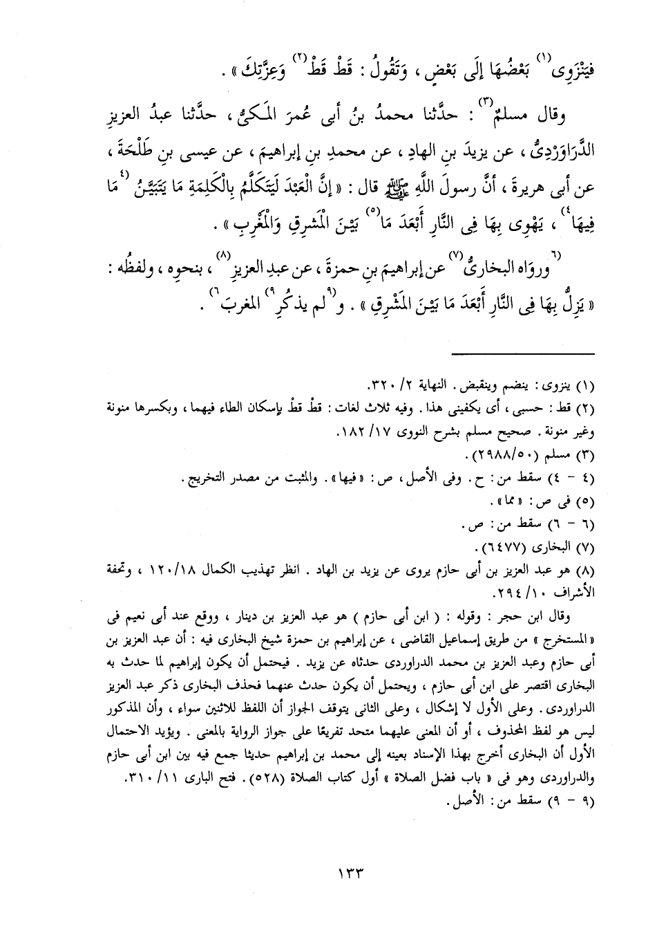 وَرَوَاهُ الْبُخَارِيُّ عَنْ إِبْرَاهِيمَ بْنِ حَمْزَةَ، عَنْ عَبْدِ الْعَزِيزِ، بِنَحْوِهِ، وَلَفْظُهُ: " يَزِلُّ بِهَا فِي النَّارِ أَبْعَدَ مَا بَيْنَ الْمَشْرِقِ ". وَلَمْ يَذْكُرِ الْمَغْرِبَ.